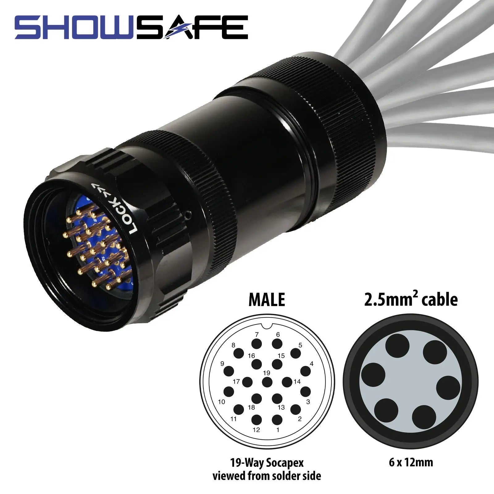 The eLumen8 Showsafe range of UL certified Socapex connectors have been manufactured to deliver the highest levels of quality reliability and safety for stage lighting connections. The super robust construction of these multi-pin devices ensures reliable operation for AV professionals. The rugged plug design has been tailored specifically for professional touring and stage lighting applications and all products are fully Socapex SL419 compatible. Showsafe 19-Pin plugs are sealed to IP67 protection when mated making them water and dust proof for festivals worldwide. The sand of Benicassim? The mud and rain of Glastonbury? No problem. Model reference: P19-LM-S-SPR-BK-NUM Inline male 6 x 12mm (2.5mm² cable) UL approved to UL1977 standard 100% UK manufactured and assembled Amphenol Socapex SL419 compatible 19-Pin connectors are all rated at 25A Multi-point gold plated contacts Integral insulation sleeves