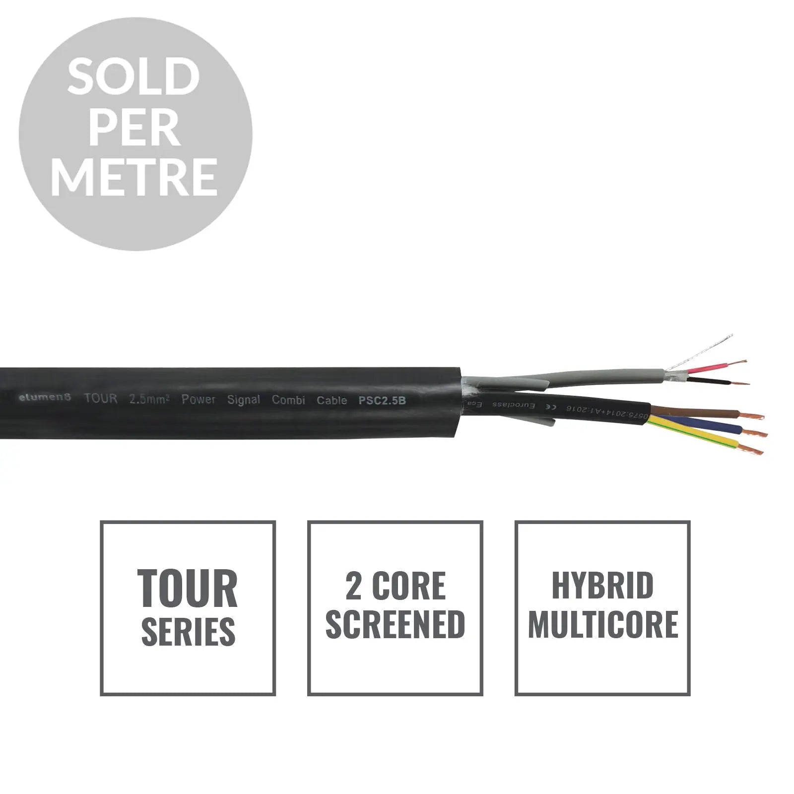 Hybrid multicore comprising of a screened and jacketed signal pair combined with 2.5mm jacketed power cables. Ultra flexible and designed for touring use this cable range provides a solution to the problem of integrated signal and power distribution. Constructed using carefully selected fillers to maintain the overall shape and facilitate easier coiling. Please note: Shipping charges may apply Sold per metre (Please specify your requirements in the notes section when ordering eg 20m in 1m cuts 50m in 10m cuts etc) Analogue or AES digital audio RS422/485 or DMX512 control with a three core power cable H05VV-F harmonised standard 2.5mm² power Suitable for most 110Ω balanced data application such as RS422 RS485 DMX512 and timecode Oxygen-free copper cores for maximum signal integrity