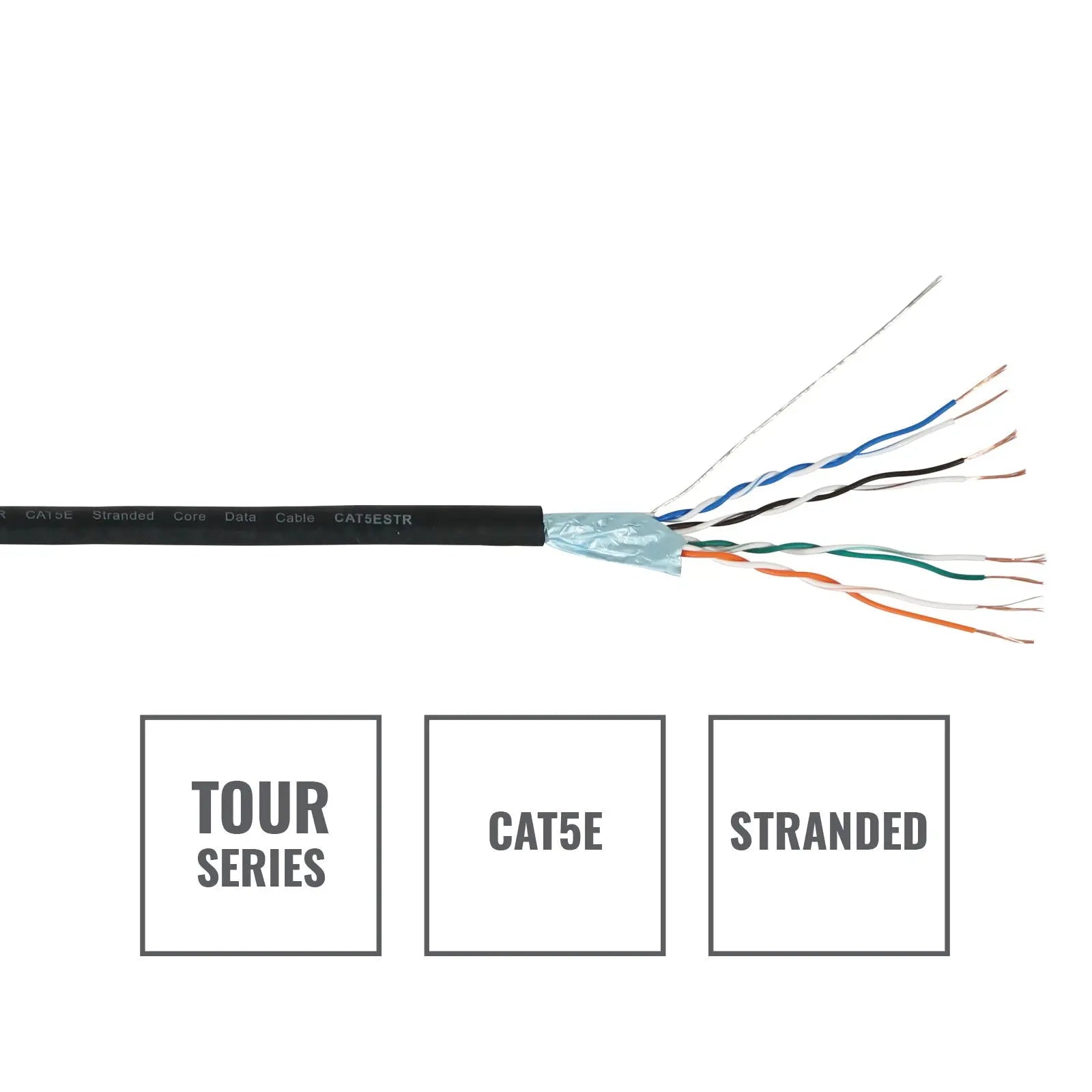 Touring quality 4 pair screened CAT5e cable suitable for heavy-duty stage LAN applications. The cable is constructed from four pairs of oxygen-free stranded copper cores protected by an overall aluminium polyester foil together with a tinned oxygen-free copper woven drain wire. The cable is finished with a low memory super flexible outer PVC jacket for ultimate flexibility. Stranded bare copper cores Aluminium/polyester foil screen plus drain wire High density Polyethylene inner core insulation Colour coding: White/Orange-Orange White/Green-Green White/Blue-Blue White/Brown-Brown Super flexible PVC outer jacket Supplied on 300m reels