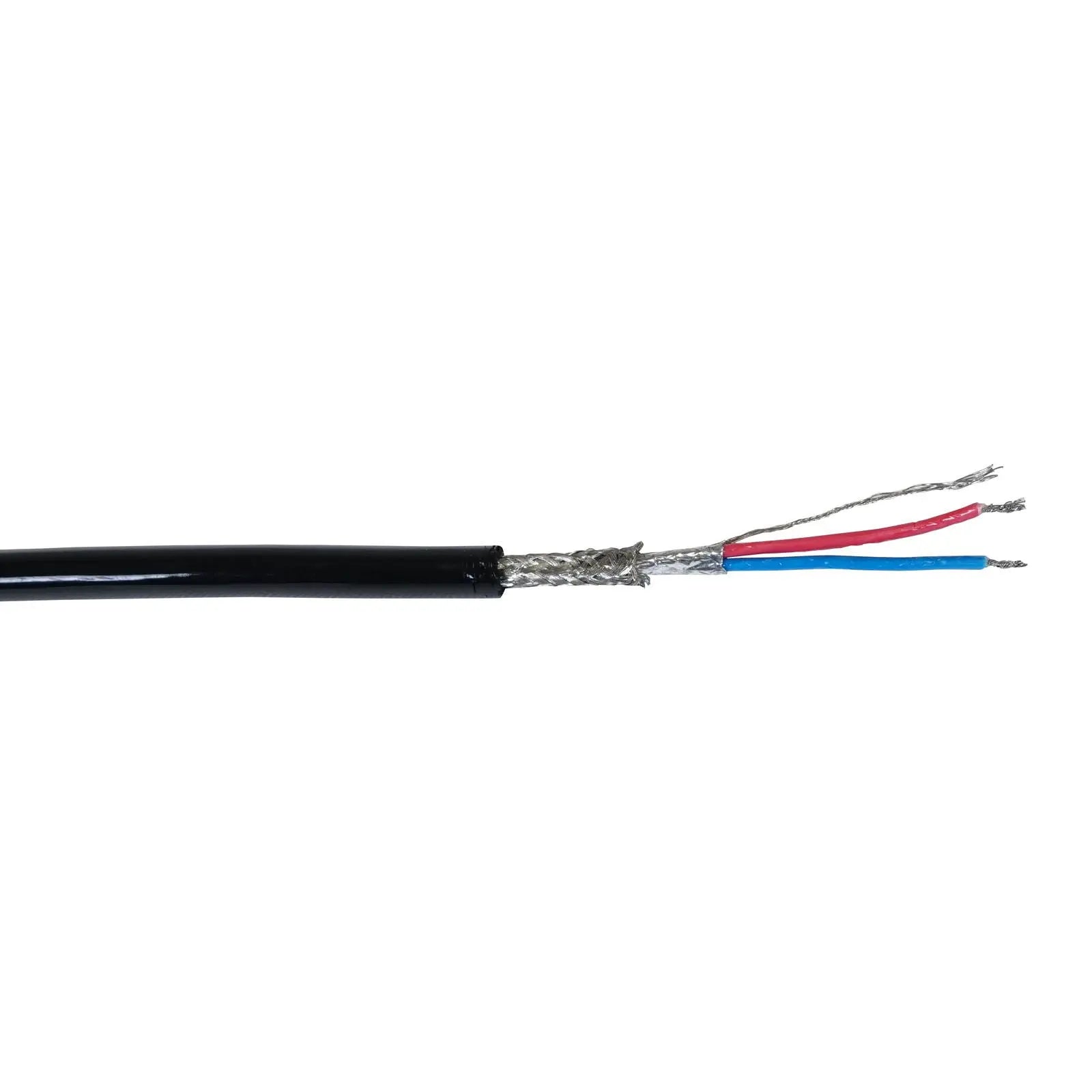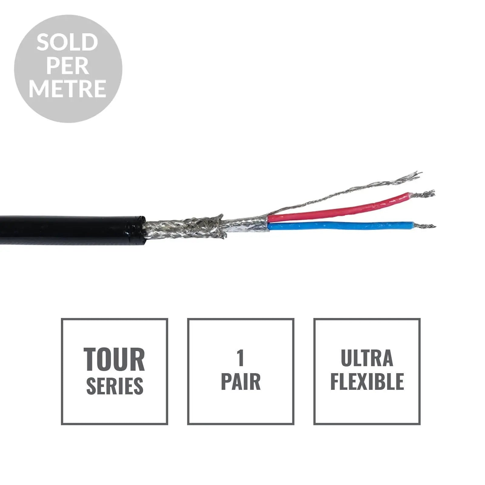 Touring quality 1 pair screened DMX cable suitable for heavy duty stage lighting control applications. The cable is constructed from a pair of tinned oxygen-free copper cores protected by both aluminium polyester foil and a tinned oxygen-free copper woven braid complete with drain wire. The cable is finished with a super flexible outer thermoplastic polyurethane (TPU) jacket for the ultimate flexibility while allowing cables to be coiled many times over under the harsh environments of touring and professional theatre. Rugged and durable – designed with touring in mind 110Ω impedance Tinned copper cores 1 pair plus braided screen and tinned drain wire Aluminium/polyester foil screen Colour coding: Red/Blue Super flexible thermoplastic polyurethane outer jacket Supplied on 100m reels