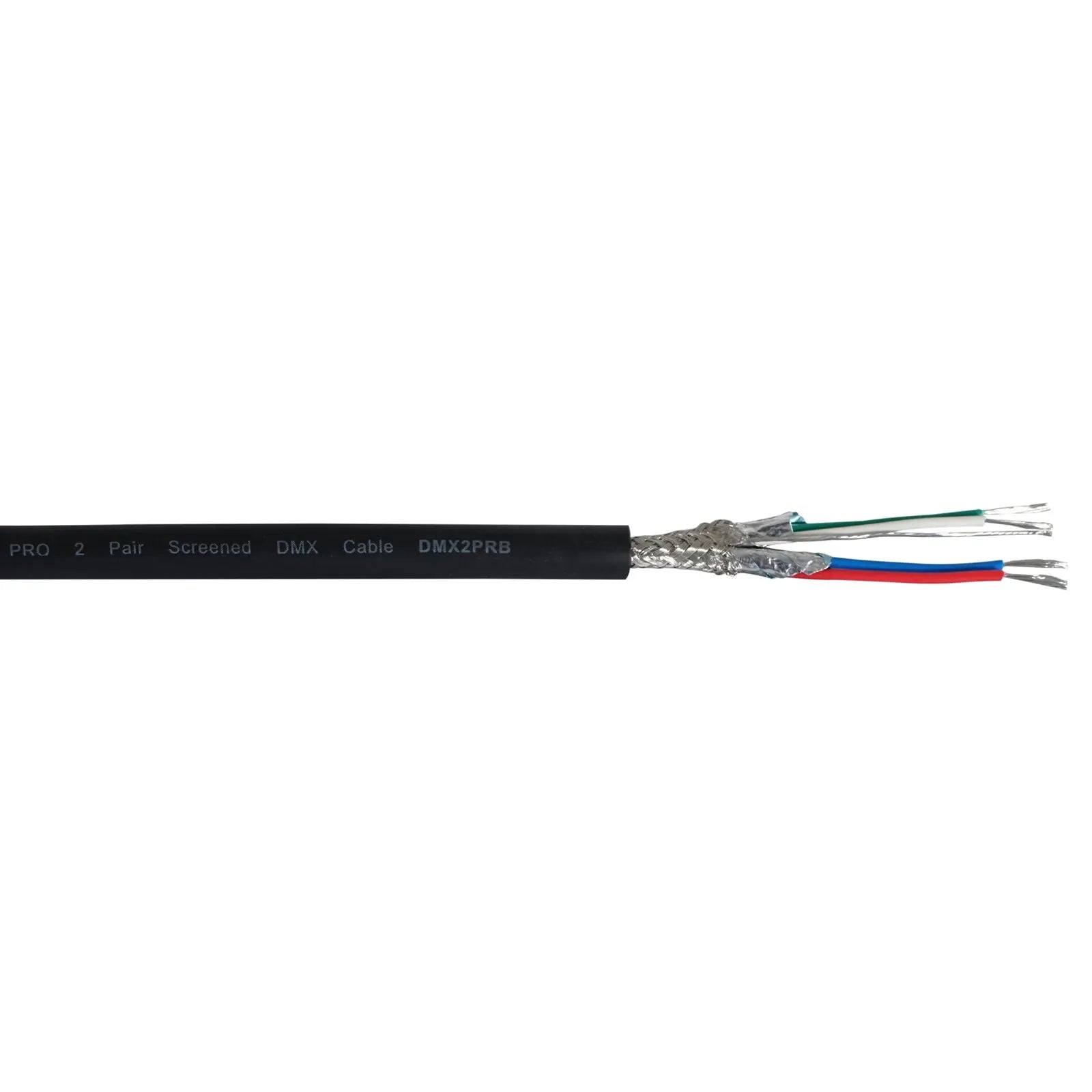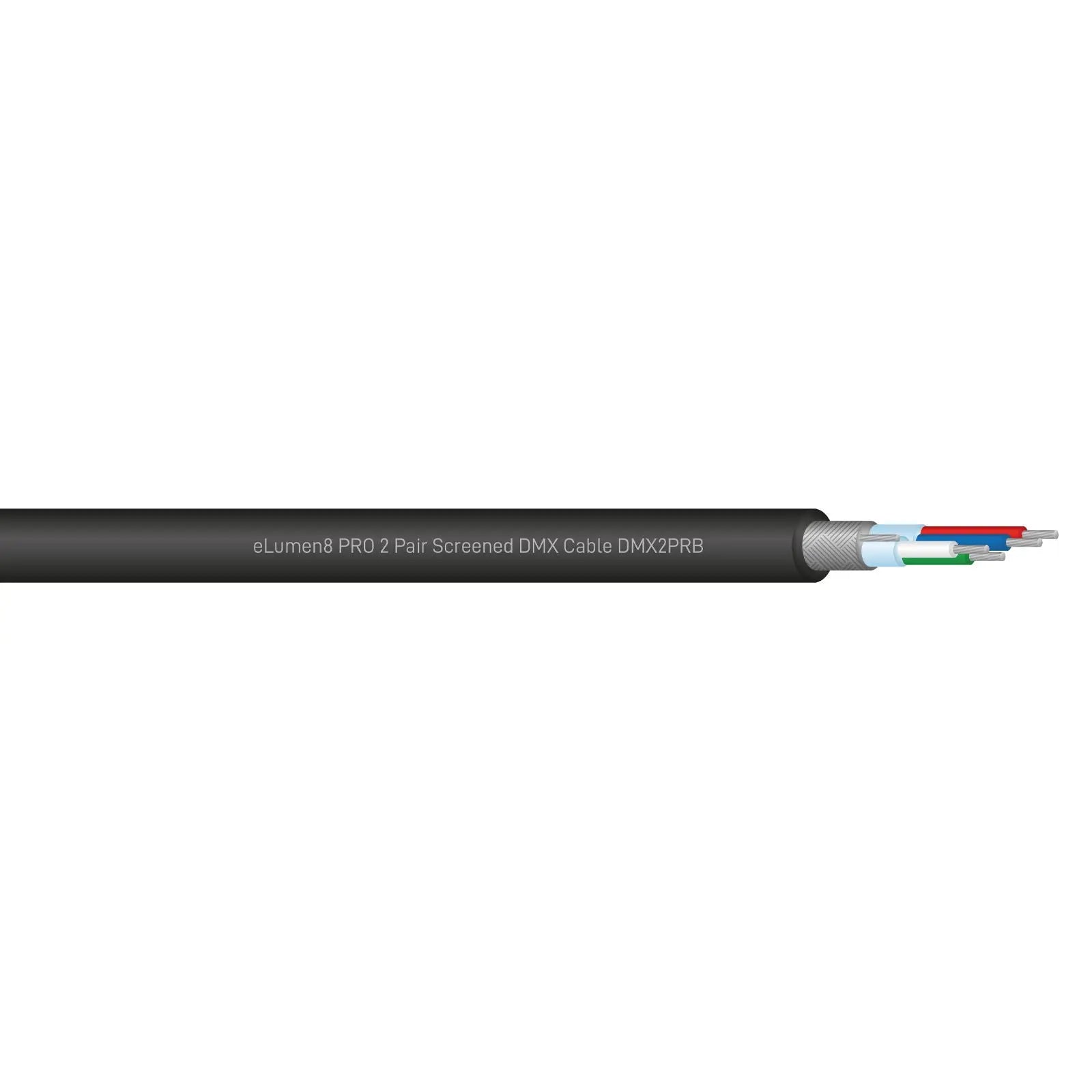Touring grade 2 pair screened DMX cable suitable for heavy duty stage lighting control applications. The cable is constructed from a pair of tinned oxygen-free copper cores protected by both aluminium polyester foil and a tinned oxygen-free copper woven braid complete with drain wire. The cable is finished with a low memory super flexible outer PVC jacket for the ultimate flexibility. The outer diameter of 7.8mm is designed so it still fits into the cable glands on most 5-Pin XLR connectors. 110Ω impedance Tinned copper cores 2 pair plus braided screen and tinned drain wire Aluminium/polyester foil screen for each pair Colour coding: Red/Blue/White/Green Super flexible PVC outer jacket Supplied on 100m reels
