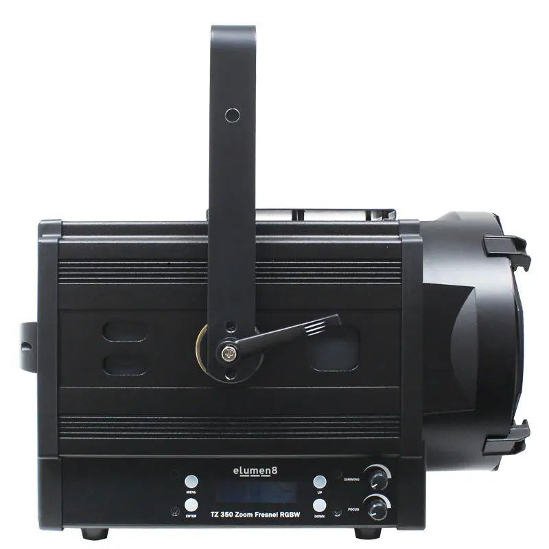 The TZ 350 LED Zoom Fresnel is a high performance luminaire for general long throw lighting applications. This fixture offers a superior light output and are supplied with a filter frame and barn doors. The 4 button display allows users to select DMX and manual dimming modes along with dimming curves. 2 year warranty 1 x 350W quad-colour COB LED (RGBW) Adjustable beam angle: 13°- 45° 13° - 24500 Lux @ 2m (full on) 45° - 8300 Lux @ 2m (full on) Refresh rate: 7.2kHz Motorised zoom DMX channels: 5 or 7 selectable RDM (Remote Device Management) 0 - 100% dimming Variable strobe 4 dimming curves in both LED and halogen profiles: Linear square law inverse square law and S-curve 4 button menu with LCD display powerCON input/output 5-Pin XLR input/output 3-Pin XLR input/output Filter frame and barn doors included Fan cooled