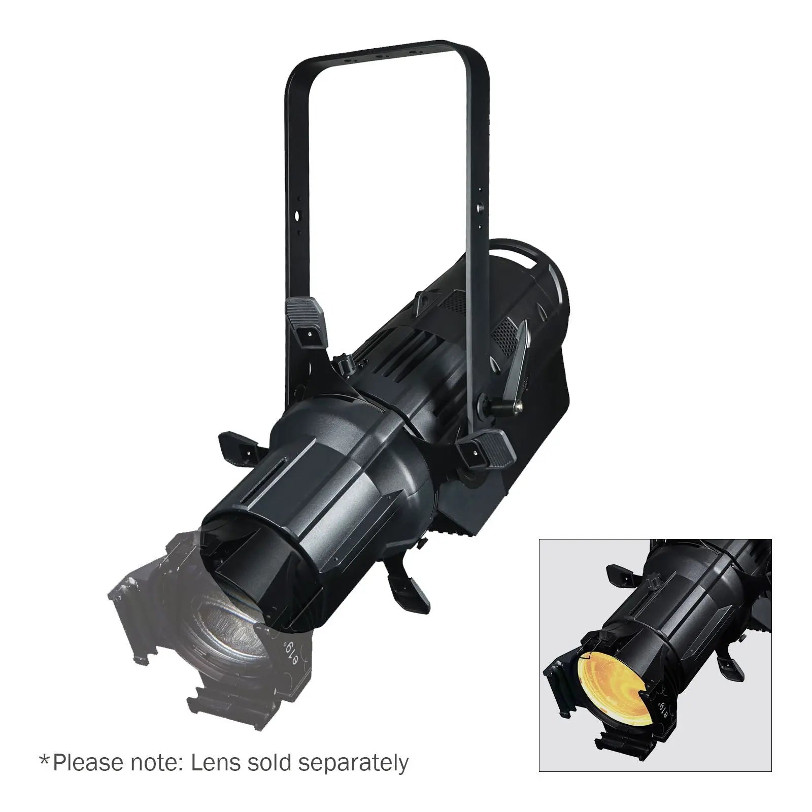 The Elumen8 Virtuoso 1000 Profile WW MKII features an advanced optical system that outputs a flat even field and is suitable for many applications. Focus the fixture without DMX signal at the push of a button thanks to the ‘instant focus’ mode. Other on-board features include; DMX RDM an adjustable PWM rate 575W or 750W power modes and the ability to use with a traditional dimmer pack. Due to the design of the body many common and aftermarket lens tubes can fit directly onto the fixture allowing you to upgrade to LED without having to replace your existing lens tubes. Sold as the body only with optional lenses and accessories available. Compatible with most industry standard lenses including Source 4. Improved CRI 2 power emulation modes (575W and 750W) Can be used with a traditional dimmer pack2 year warranty 1 x 300W warm white COB LED (3200K) Beam angle: 5°- 50° dependent on lens used CRI: 98 CQS: 96 TLCI: 98 Refresh rate: 1.2kHz 2kHz 2.4kHz 6kHz or 25kHz selectable Beam framing shutters DMX channels: 1/2/3 or 4 selectable RDM (Remote Device Management) 0 - 100% 8 or 16 bit dimming Variable strobe 4 dimming curves: Linear square law inverse square law and S-curve 4 button menu with LCD display PowerTwist TR1 input/output 5-Pin XLR input/output 3-Pin XLR input/output 3 selectable fan modes (live power and studio) Instant fast focus mode Rear handle