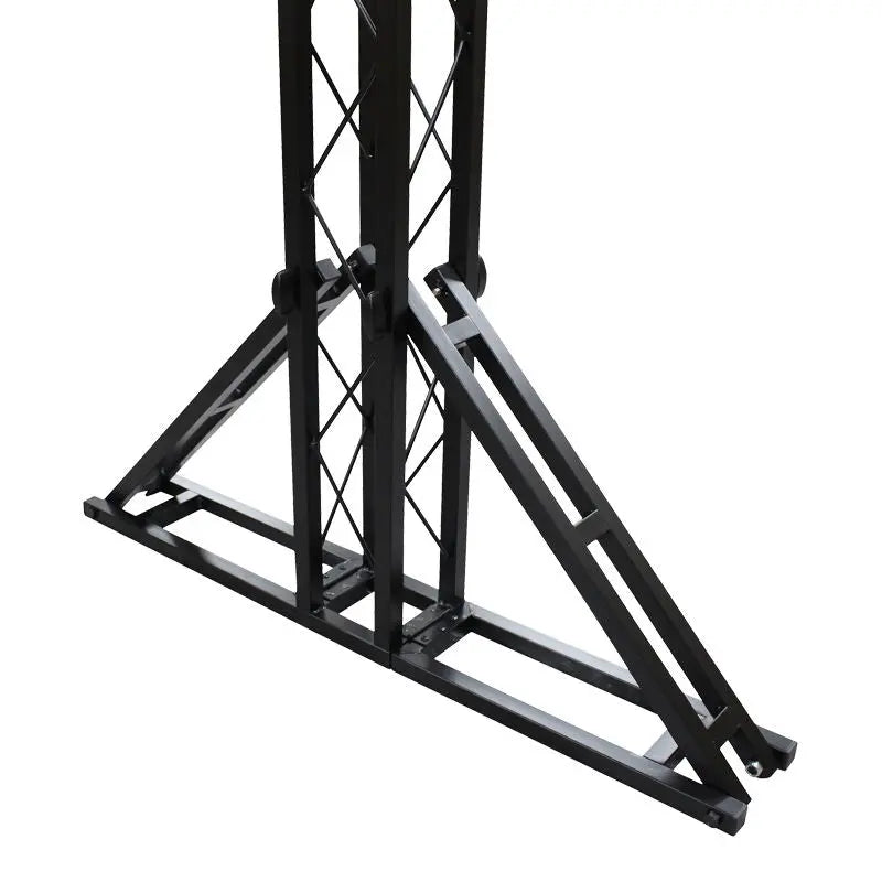 This complete 3 x 2m truss system comes in three easy-to-build and transport pieces made from quad style trussing. The system has a small footprint so is suitable for mobile entertainers bands and many other applications. The horizontal bar comes as one section folding in the middle making it even more manageable and quick to build. All metal construction Comes complete with fixings Features a black powder coated finish Comes in 3 easy-to-build and transport pieces (The top truss is hinged and folds in half for easy transportation whilst the feet and leg supports fold flat against the truss uprights) Optional 0.5m extension legs available - Order code: STAN90B