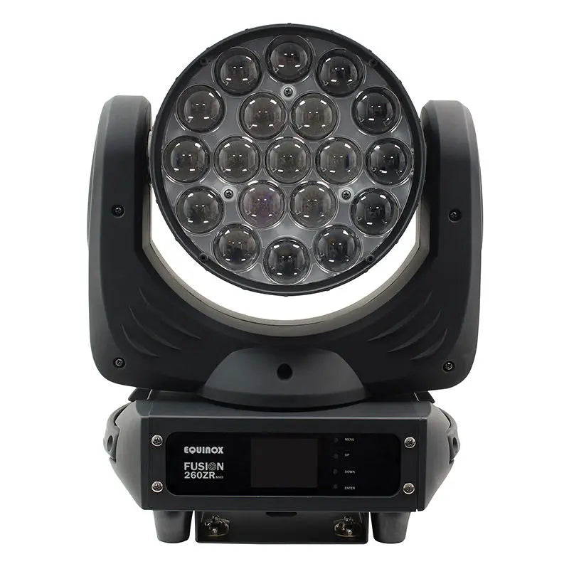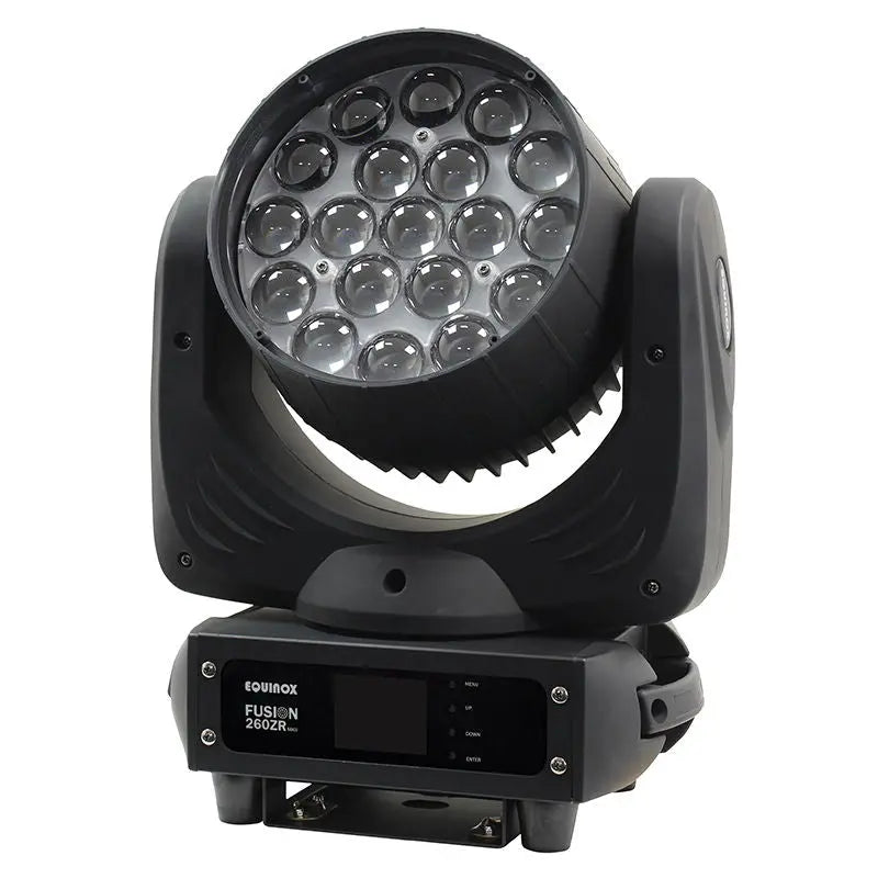 The Equinox Fusion 260ZR MKII Moving Head Wash Light takes performance to the next level with quieter temperature-controlled fans smoother movement and refined dimming control. Equipped with 19 x 12W RGBW quad-colour LEDs it delivers everything from soft pastels to vivid saturated colours with exceptional clarity.Designed for creative versatility the LEDs are arranged in three concentric rings enabling dynamic colour chases eye-catching patterns and comprehensive wash coverage. A motorised zoom range of 6°–50° provides both tight beam effects and wide-angle washes adapting effortlessly to a range of performance environments.Ideal for concerts theatre productions and live events the Fusion 260ZR MKII is a powerful and reliable tool for any lighting designer.Contact our team today to learn more or to arrange a demonstration. Improved dimming Smoother movements Quieter temperature controlled fans Dimming curves and refresh rate settings
