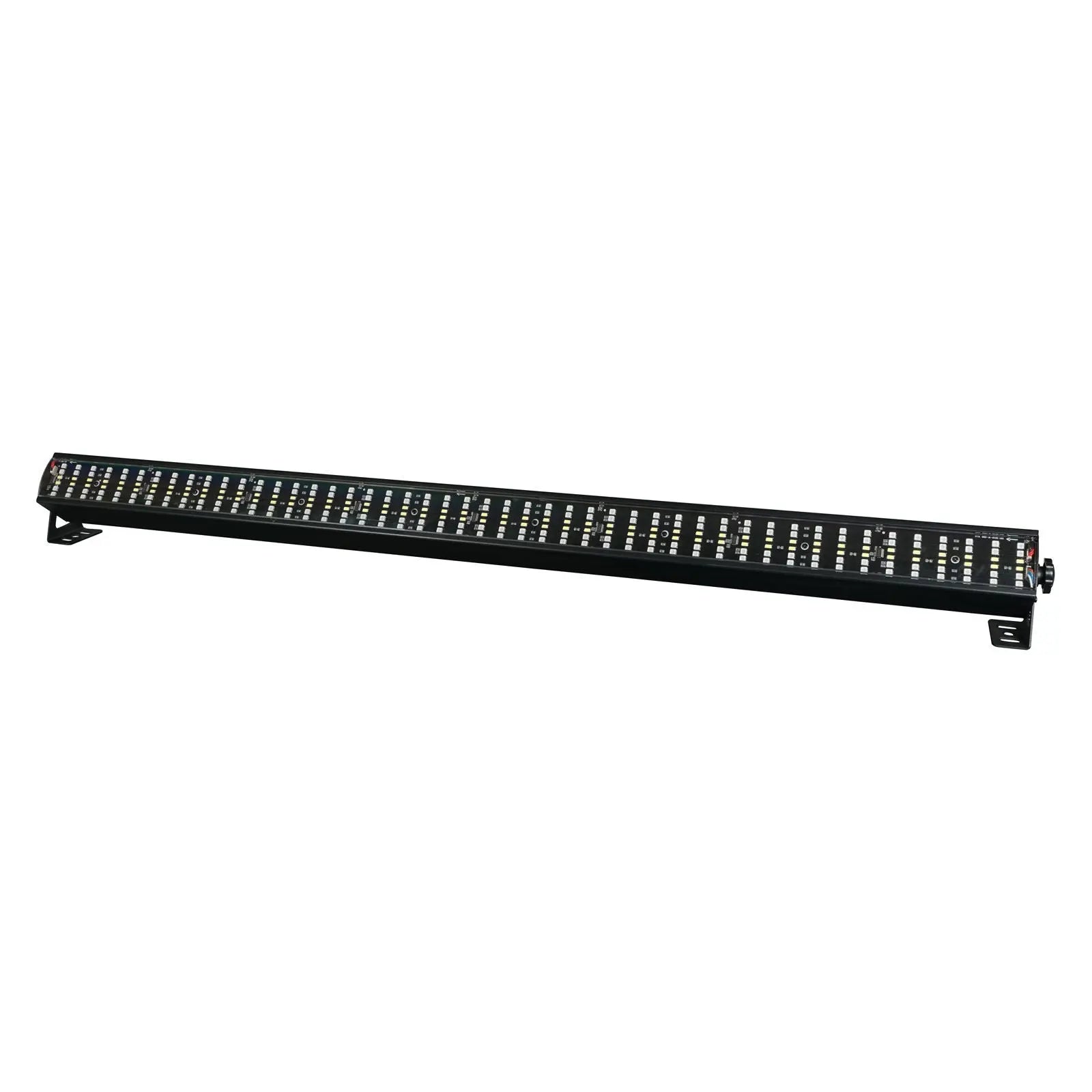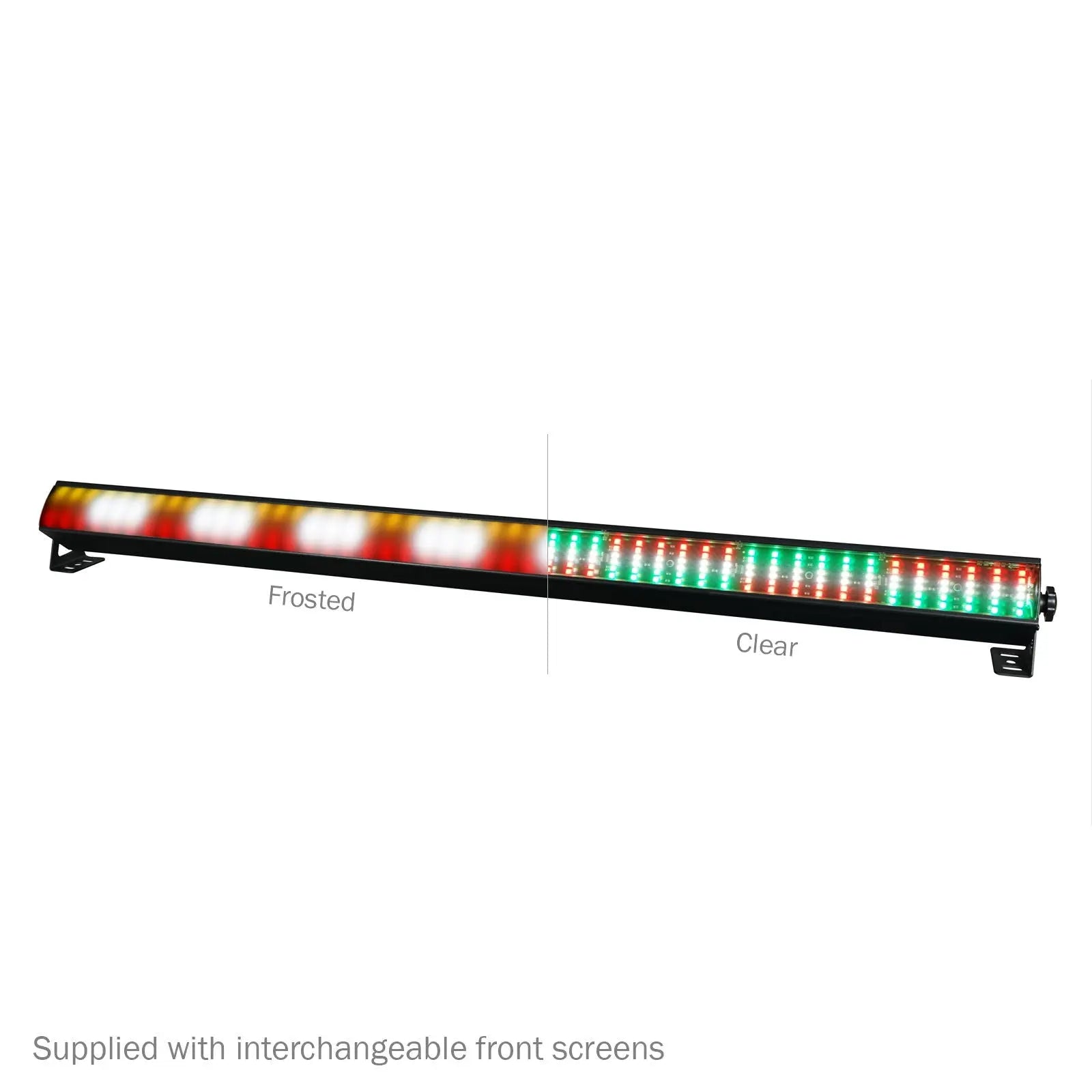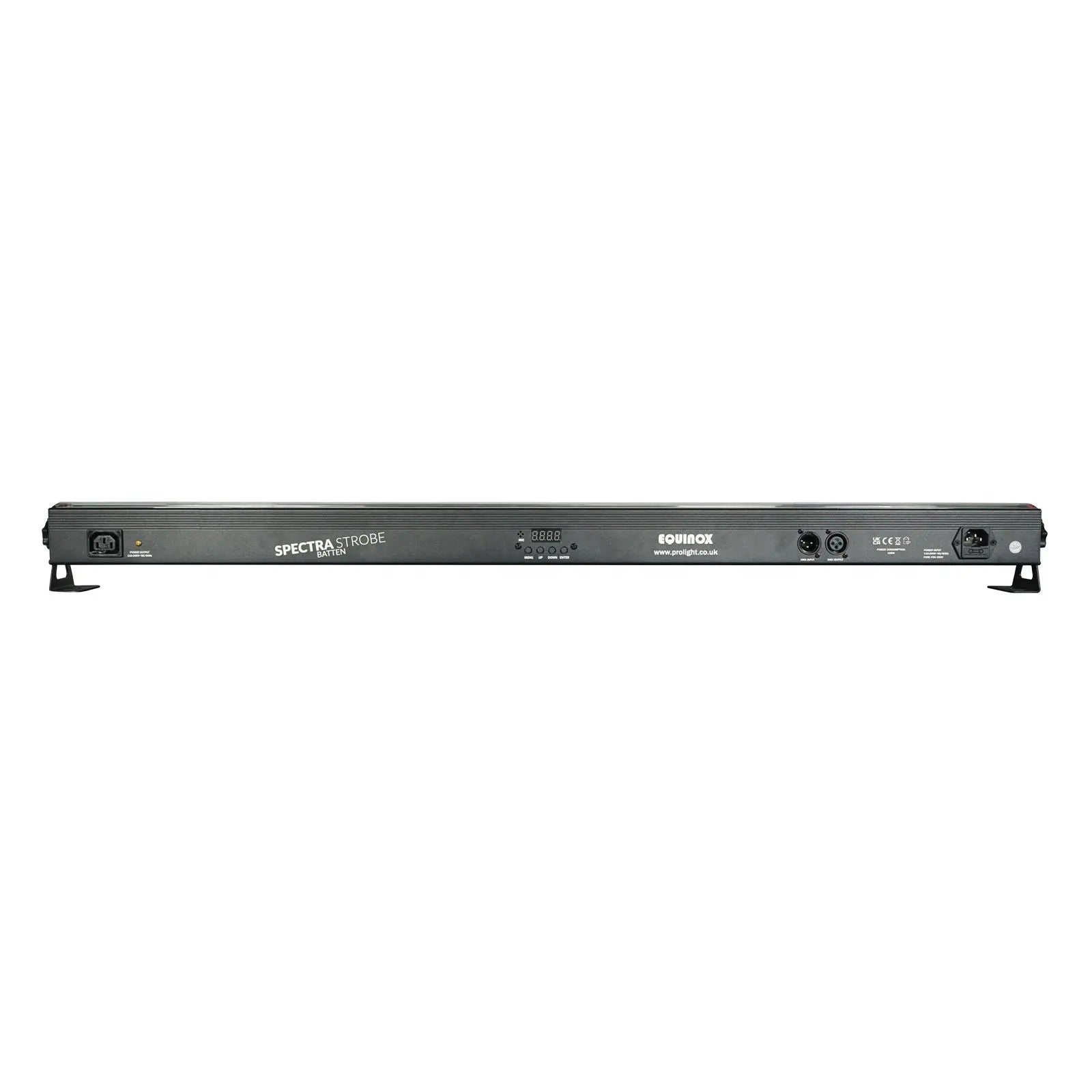 The Spectra Strobe Batten contains 192 SMD 5050 RGB LEDs divided into 16 segments plus a central strip of 96 white SMD 5630 LEDs. They feature a wide 135° viewing angle and milky frost effect front screen. A clear front screen is also included to further expand the versatility of this fixture. Onboard features allow the user to create soft washes from its rich colour palette as well as dynamic strobe effects. A number of chase programs are included and can be selected by the control panel along with speed and variable strobe. 192 tri-colour SMD 5050 LEDs (RGB) plus 96 white SMD 5630 LEDs (CW) Viewing angle: 135° Refresh rate: 10kHz DMX channels: 6/9/12/32 or 64 selectable Static colour auto sound active and master/slave modes plus built-in programs 0-100% dimming Variable strobe Bracket allows for multiple rigging or floor standing applications 4 button menu with LED display IEC power input/output 3-Pin XLR input/output Convection cooled