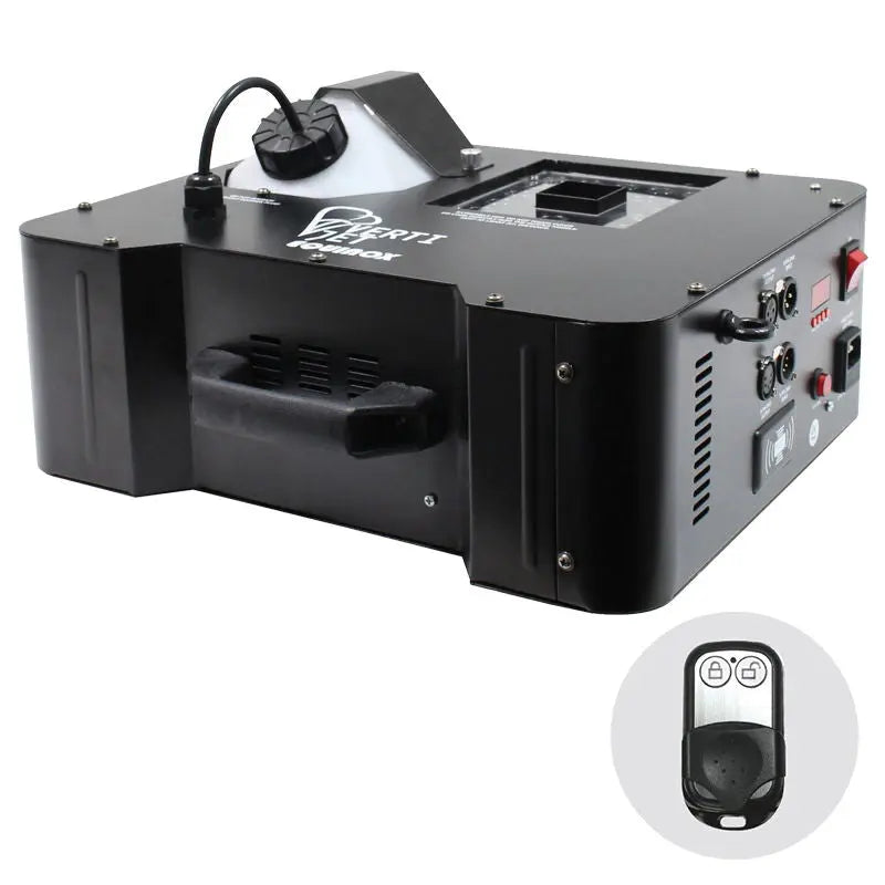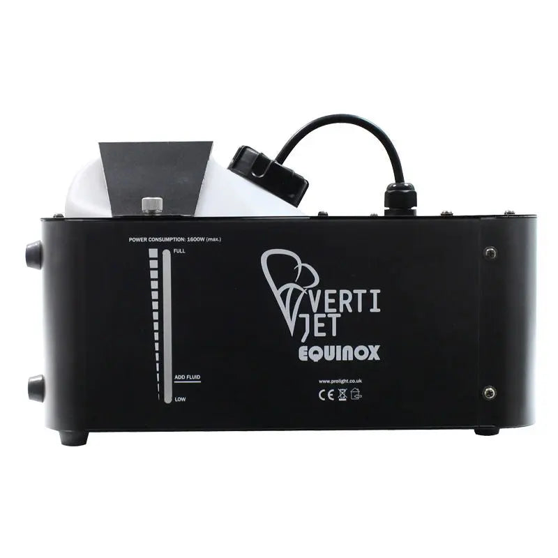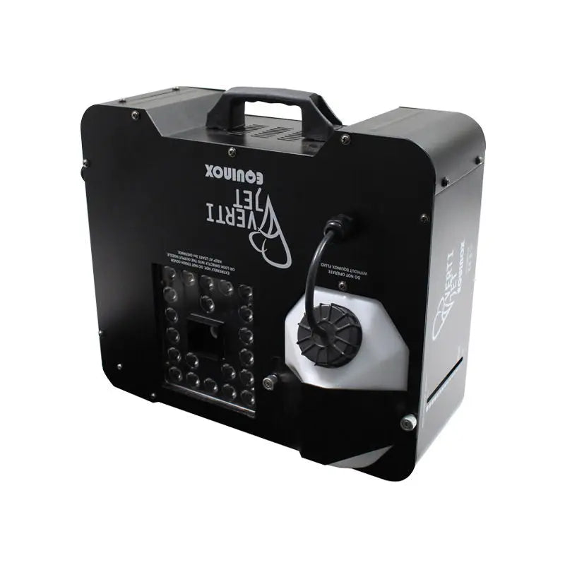 The Equinox Verti Jet (EQLED356) blends a high-output fogger and LED wash in one compact unit producing CO₂-style vertical smoke blasts up to 8 m and vibrant RGB illumination through 21×3 W LEDs. With a 1500 W heater and 2.5 L tank it delivers 12000 cu ft/min of dramatic atmospheric effect—ideal for live events stages and DJ setups. 21 x 3W LEDs (R: 7 G: 7 B: 7) 1500W heater Smoke output: approx. 12000 cu.ft per minute Projection distance: 6-8m Warm-up time: approx. 4-5 mins Tank capacity: 2.5 litres DMX channels: 7 Static colour colour change and auto modes 4 button menu with LED display IEC power input 3-Pin XLR input/output 5-Pin XLR input/output Wireless remote control included Use with water based effect fluid