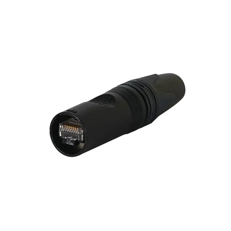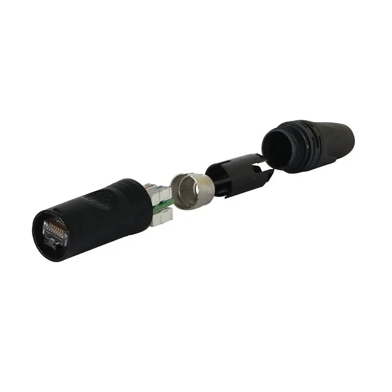A nickel plated etherCON CAT6A connector self-termination for insulation diameter ≤1.1mm. The set NE8MX6-B consists of a cable plug carrier offering a robust metal shell proven Neutrik chuck-type strain relief and a CAT6A compliant RJ45 plug carrier offering a robust metal shell proven Neutrik chuck-type strain relief and a CAT6A compliant RJ45 plug. The set is suitable for a cable diameter range of 7mm to 9.5mm and wire gauge of AWG24/1 - AWG22/1 (solid) or AWG24/7 - AWG22/7 (stranded). Please note: Does not intermate with the CAT6 chassis connectors NE8FDY-C6 and NE8FDY-C6-B. If the insulation diameter is =1.1mm please refer to CONN273. Ruggedized connector with CAT6A component compliance according to ISO/IEC 11801 and TIA/EIA 568-C.2PoE++ compliant according to 802.3bt Type4 IP65 protected when mated with NE8FDX-P6-W or NE8FDX-Y6-W Rugged latch lock system million fold proven Intermateable with the existing etherCON CAT5 range Unique Neutrik chuck-type strain relief