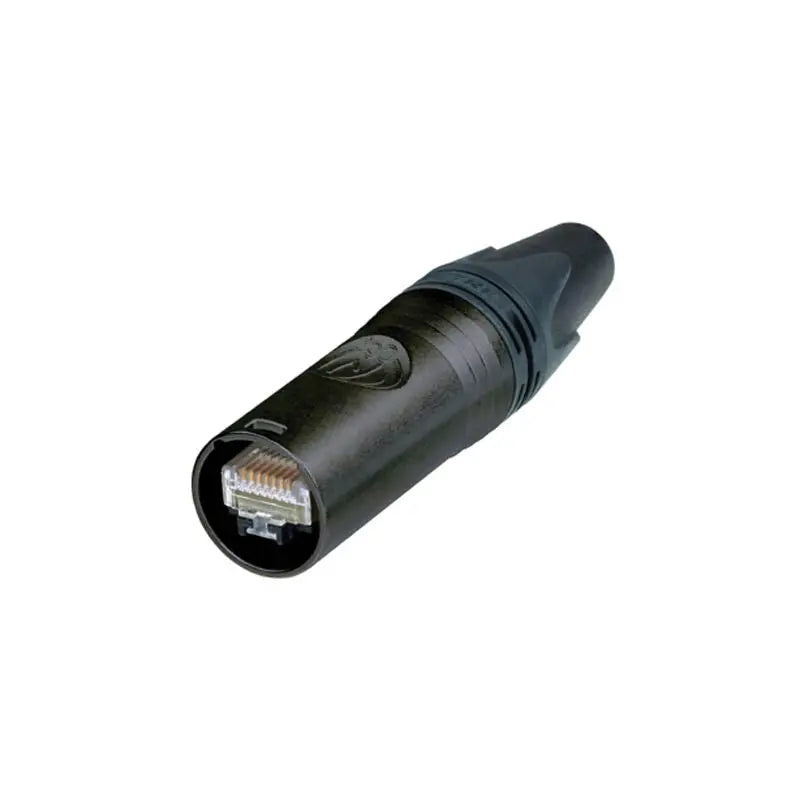A black chromium etherCON CAT6A connector self-termination for insulation diameter =1.1mm. The set NE8MX6 consists of a cable plug carrier offering a robust metal shell proven Neutrik chuck-type strain relief and a CAT6A compliant RJ45 plug. The set is suitable for a cable diameter range of 7mm to 9.5mm and wire gauge of AWG26/1 – AWG24/1 (solid) or AWG27/7 – AWG24/7 (stranded). Please note: Does not intermate with the CAT6 chassis connectors NE8FDY-C6 and NE8FDY-C6-B. Ruggedized connector with CAT6A component compliance according to ISO/IEC 11801 and TIA/EIA 568-C.2 oE++ compliant according to 802.3bt Type4 IP65 protected when mated with NE8FDX-P6-W or NE8FDX-Y6-W Rugged latch lock system million fold proven Intermateable with the existing etherCON CAT5 range (Note! Does not intermate with the CAT6 chassis connectors NE8FDY-C6 and NE8FDY-C6-B) Unique Neutrik chuck-type strain relief