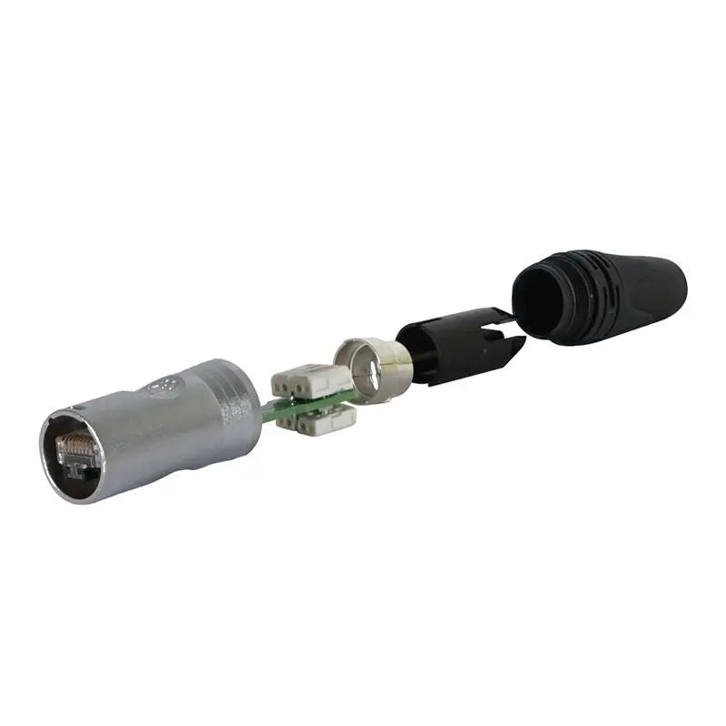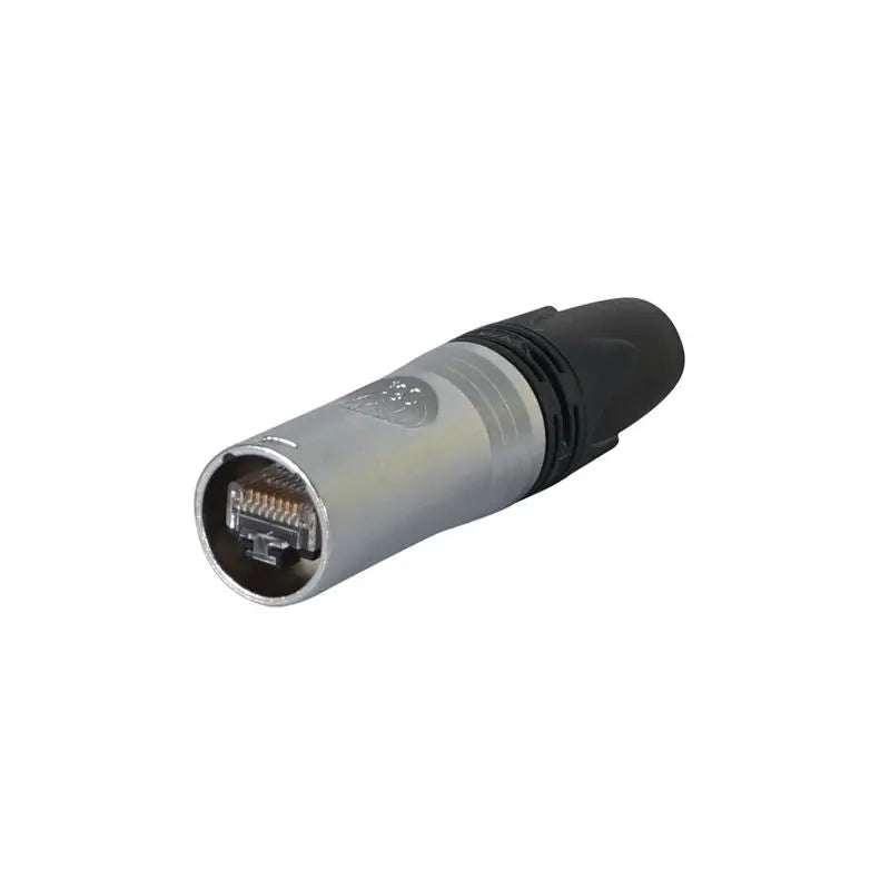 A nickel plated etherCON CAT6A connector self-termination for insulation diameter ≤1.1mm. The set NE8MX6 consists of a cable plug carrier offering a robust metal shell proven Neutrik chuck-type strain relief and a CAT6A compliant RJ45 plug. The set is suitable for a cable diameter range of 7mm to 9.5mm and wire gauge of AWG24/1 - AWG22/1 (solid) or AWG24/7 - AWG22/7 (stranded). Please note: Does not intermate with the CAT6 chassis connectors NE8FDY-C6 and NE8FDY-C6-B. If the insulation diameter is ≤1.1mm please refer to CONN273. Ruggedized connector with CAT6A component compliance according to ISO/IEC 11801 and TIA/EIA 568-C.2PoE++ compliant according to 802.3bt Type4 IP65 protected when mated with NE8FDX-P6-W or NE8FDX-Y6-W Rugged latch lock system million fold proven Intermateable with the existing etherCON CAT5 range Unique Neutrik chuck-type strain relief