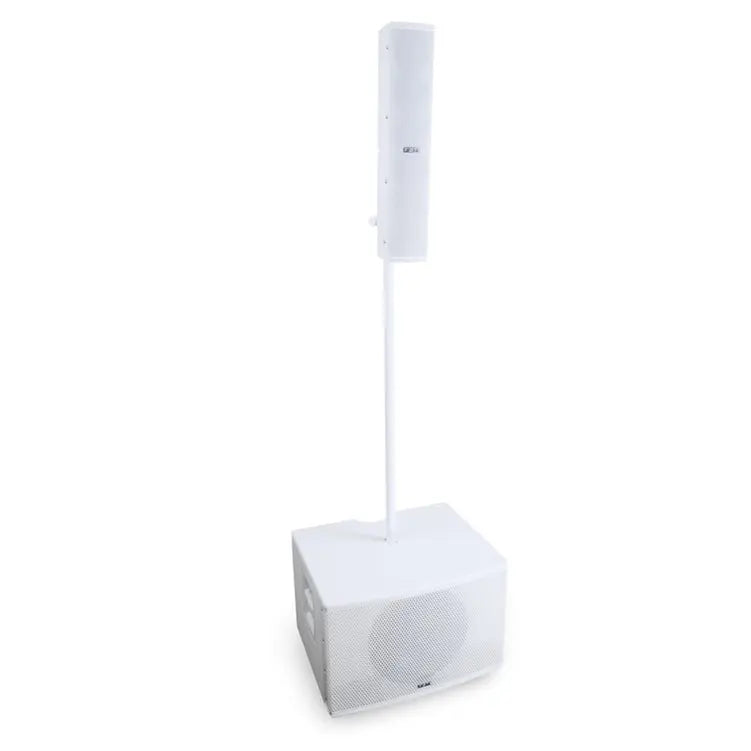 A bi-amplified design, the system comprises a long excursion 12” bass reflex subwoofer and a passive mounted satellite, linked via a Neutrik SPEAKON connector and equipped with six full-range neodymium 3” drivers. Onboard the subwoofer is a Class-D, two channel amplifier, complete with switch-mode power supply, delivering 600W RMS to the subwoofer and 400W RMS to the satellite, both of which are housed in birch plywood enclosures. For ease of use, a storage compartment is provided within the subwoofer enclosure to securely house both the satellite speaker and its supplied mounting pole for storage and transport. A dedicated locking system holds all of the equipment in place.