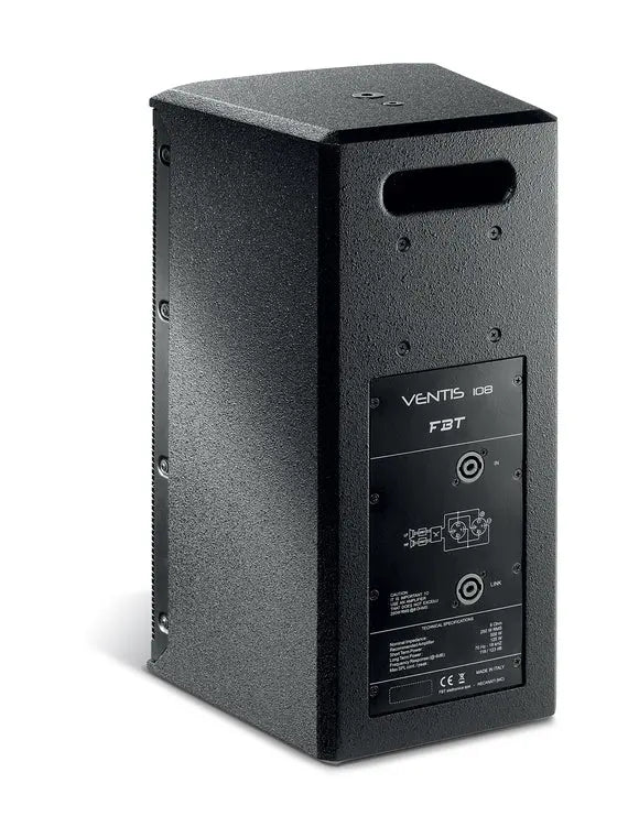 The FBT VENTIS 108 has been designed to meet the highest standards in both performance and aesthetic appeal. The FBT VENTIS are as suitable for fixed installation and portable use as they are for use on stage. The FBT VENTIS 108 incorporating an 8" LF woofer with 2" voice coil, custom made for FBT and 1" exit throat B&C HF compression driver with 1.4" voice coil; a fully rotatable constant directivity horn ensure accurate coverage (80°H x 50°V). With a frequency range from 70Hz to 18kHz the FBT VENTIS 108 speaker provides high fidelity sound for both speech and music applications with a maximum SPL of 126dB. Ideal for small fixed installations the FBT VENTIS 108 speaker system has an impedance of 8Ohm and the internal crossover is at a fixed frequency of 1.8kHz. Constructed in 0.59" birch plywood and includes one integrated handle on the rear of the speaker. Rear panel connections feature 2x Neutrik SpeakON NL4 connections for input and passthrough. The optional mounting bracket allows the FBT VENTIS 108 speaker to be surface mounted on walls or ceilings.