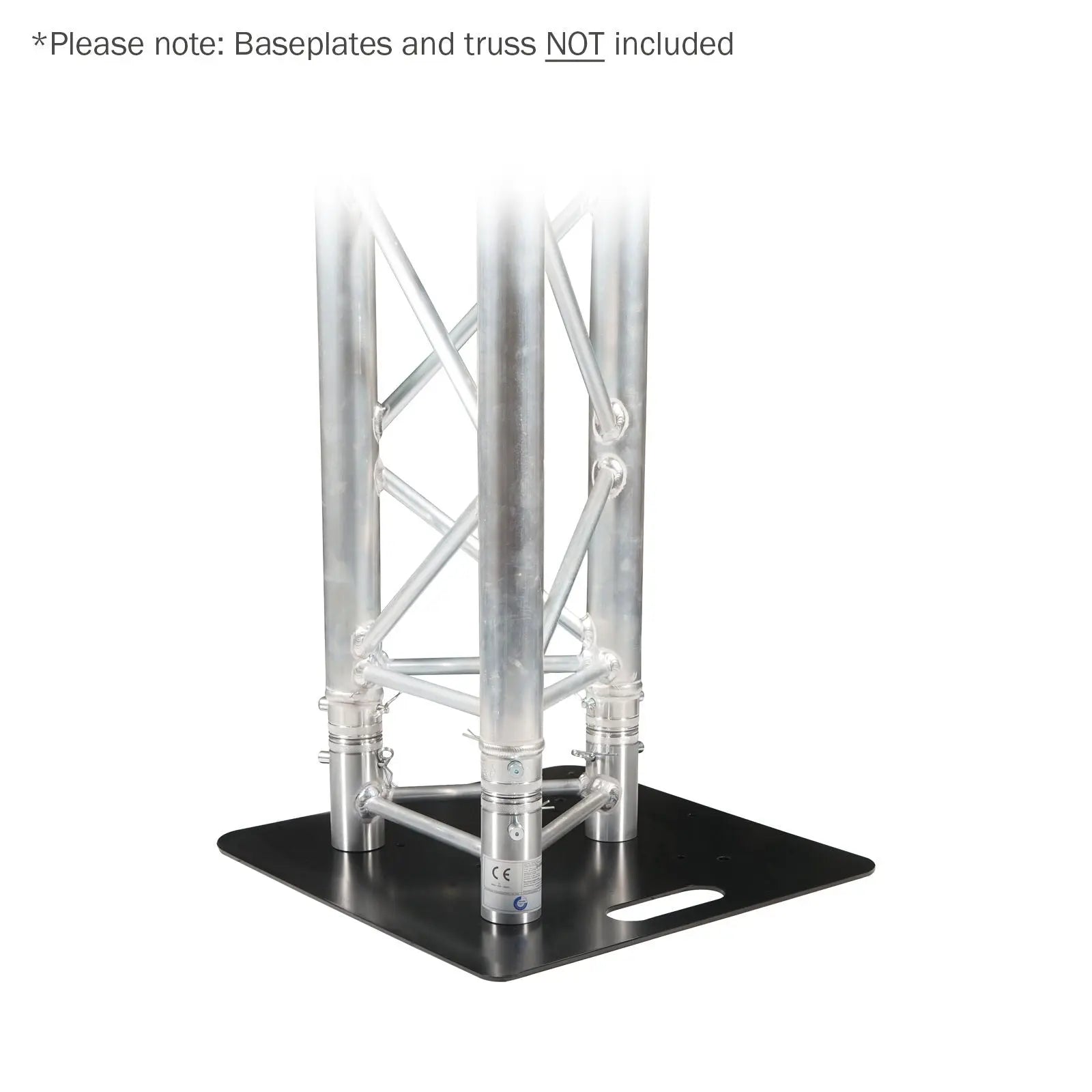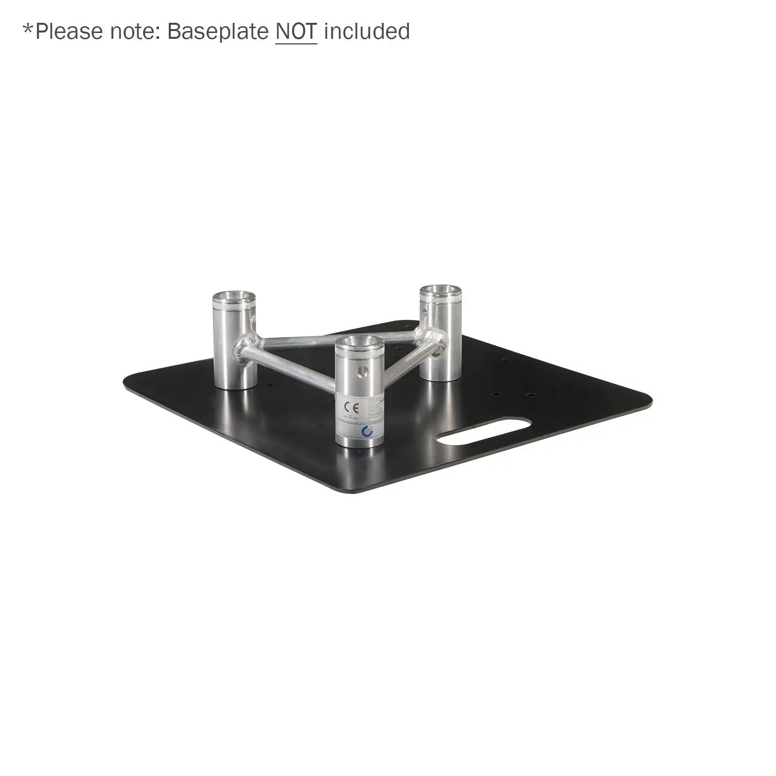 The Global Truss F34PL features TUV Certified aluminium welding and 3mm wall thickness for a superb load handling capacity. A full range of lengths baseplates corners connectors and couplers are available making them ideal for fixed installation shop fittings and rental applications. This F33PL adaptor is designed especially for use with base plates where 105mm spacers are required and structural integrity is paramount. This adaptor stops the twisting action that can be present when using three individual spacers. Manufactured with conical receivers (3 x conicals 6 x pins and 6 x R-clips included) ready to continue your construction; and threaded flanges enabling direct attachment to the base plate using countersunk M12 bolts (3 bolts included). Supplied with 3 x conicals 6 x pins and 6 x R-Clips Supplied with 3 x countersunk M12 bolts Prolyte H30 Truss compatible Superior 3mm wall thickness aluminium