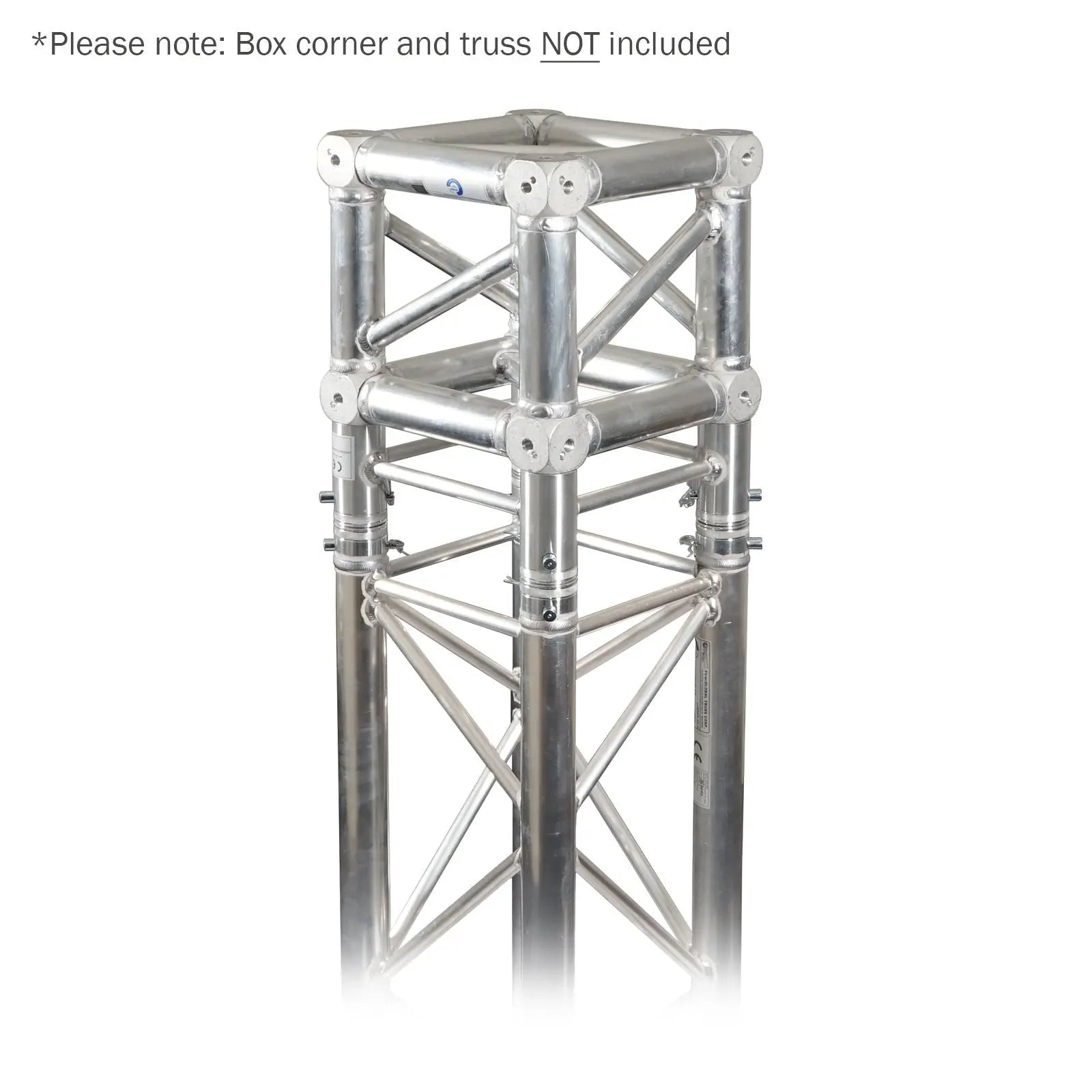 The Global Truss F34PL features TUV Certified aluminium welding and 3mm wall thickness for a superb load handling capacity. A full range of lengths baseplates corners connectors and couplers are available making them ideal for fixed installation shop fittings and rental applications. This F34PL adaptor is designed especially for use with box corners where 105mm spacers are required and structural integrity is paramount. This adaptor stops the twisting action that can be present when using four individual spacers. Manufactured with conical receivers (4 x conicals 8 x pins and 8 x R-clips included) ready to continue your construction; and drilled flanges enabling direct attachment to the box corner using M12 bolts (4 x bolts and split washers included). Supplied with 4 x Conicals 8 x Pins and 8 x R-Clips Supplied with 4 x M12 hex bolts and split washers Prolyte H30 Truss compatible Superior 3mm wall thickness aluminium