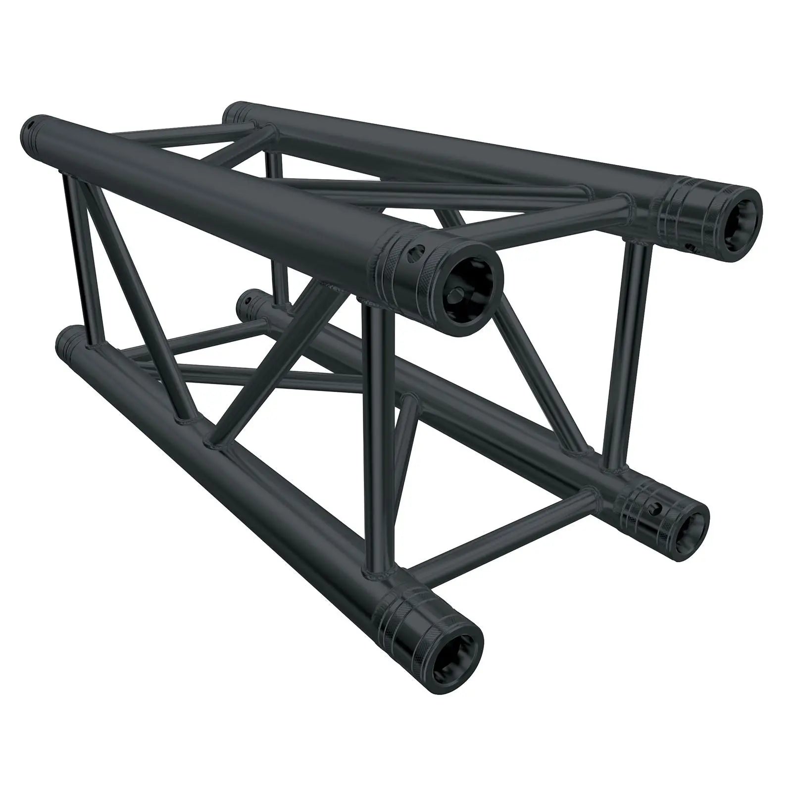 The F34 truss series by Global Truss is a TÜV approved 4-point system with an external dimension of 29cm. With its excellent load capacity relative to weight and size the F34 system is one of the most widely used in the industry. From exhibition stands and shop fittings to stage roofs and outdoor structures F34 truss offers versatility and strength. Constructed from 50x2mm main tubes and 20x2mm diagonal braces of aluminium each section is supplied with conical connectors for secure assembly. This black powder-coated version provides a professional finish suitable for stage and event environments. The system can also be powder coated in any RAL colour on request. Supplied with 4 x Conicals 8 x Pins and 8 x R-Clips 2mm wall thickness aluminium Powder coated black finish