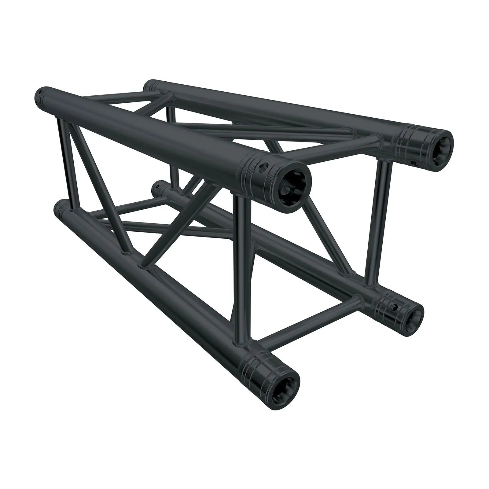 The F34 truss series by Global Truss is a TÜV approved 4-point system with an external dimension of 29cm. With its excellent load capacity relative to weight and size the F34 system is one of the most widely used in the industry. From exhibition stands and shop fittings to stage roofs and outdoor structures F34 truss offers versatility and strength. Constructed from 50x2mm main tubes and 20x2mm diagonal braces of aluminium each section is supplied with conical connectors for secure assembly. This black powder-coated version provides a professional finish suitable for stage and event environments. The system can also be powder coated in any RAL colour on request. Supplied with 4 x Conicals 8 x Pins and 8 x R-Clips 2mm wall thickness aluminium Powder coated black finish