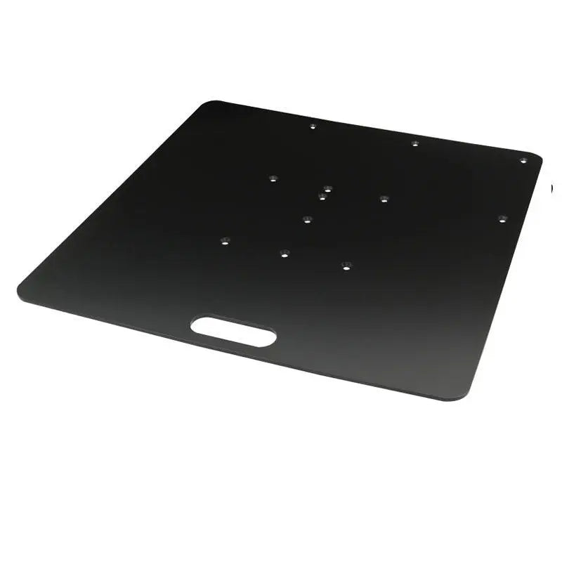 UBP800 Multi Base Plate 800 x 800mm Black F31-F34 truss or Curtain Call pipe and drape (no conicals or spigot supplied). Manufactured in the UK from high grade laser cut 8mm steel plate finished with semi-gloss black powder coat finish. The universal hole patterns allow full compatibility across Global Truss and most other brands of 290mm truss. Please note: Shipping charges may apply For use with F31-34 Standard or PL Truss Requires GL3000 half conical connectors for PL series GL5003 half conicals for Standard series (not included) Also for use with Curtain Call Pipe and Drape (spigot required) Prolyte H30 Truss compatible Carry handle for ease of movement