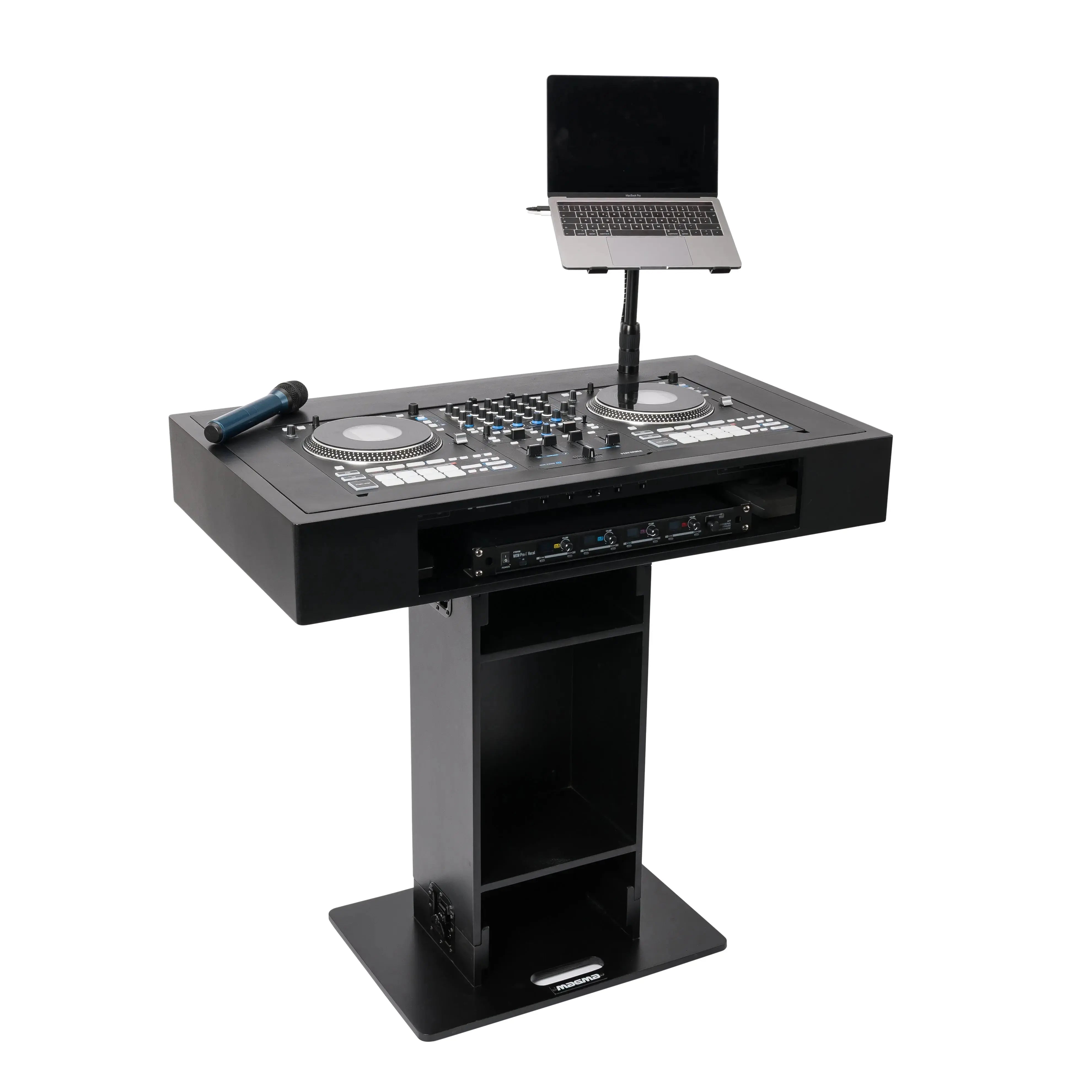 Integrated Adjustable Laptop Stand: Comes standard with a fully adjustable laptop stand, offering precise control over its height, tilt, and rotation. This ensures optimal positioning for your laptop, enhancing ergonomic comfort and visibility during your set.