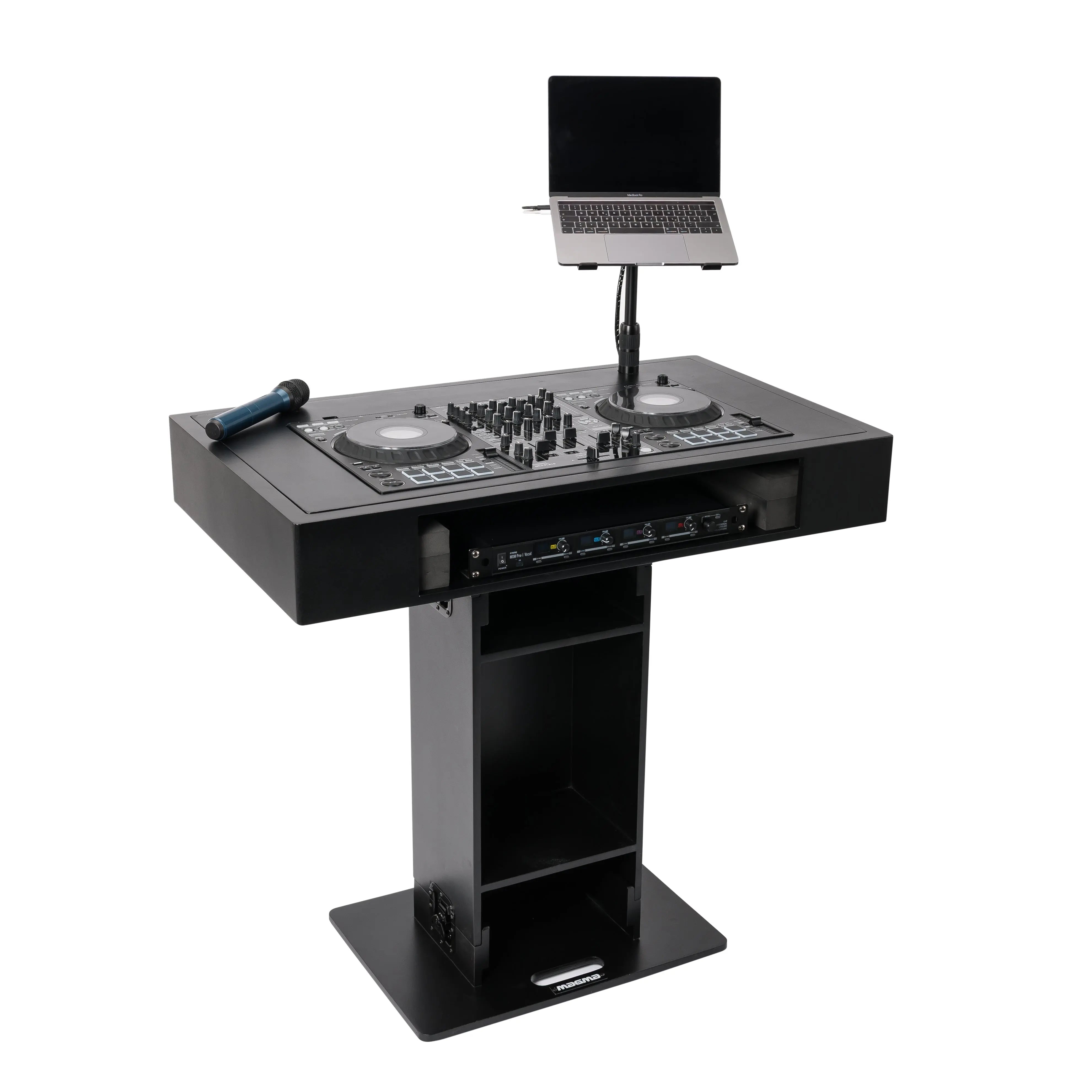 Integrated Adjustable Laptop Stand: Comes standard with a fully adjustable laptop stand, offering precise control over its height, tilt, and rotation. This ensures optimal positioning for your laptop, enhancing ergonomic comfort and visibility during your set.