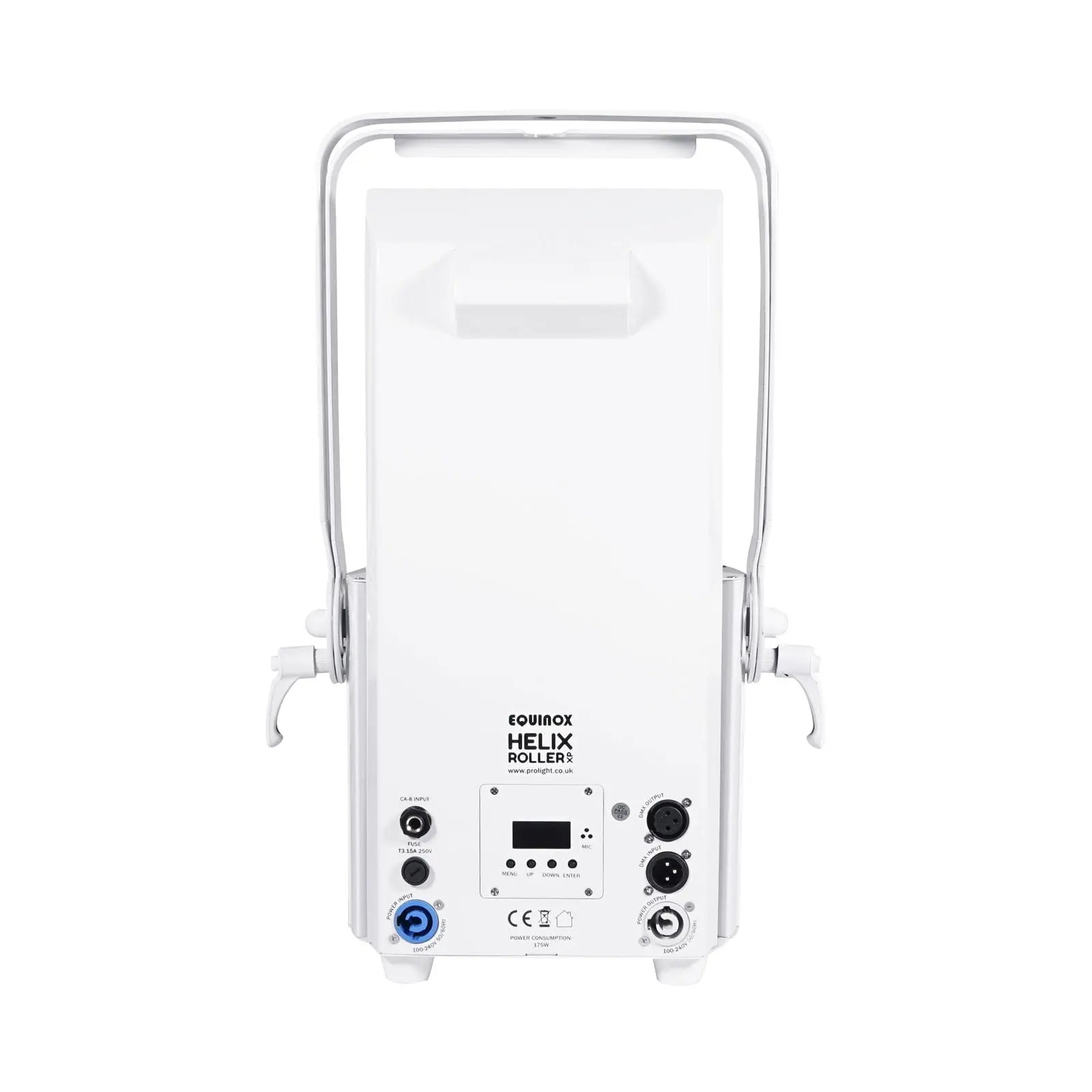 The Equinox Helix Roller XP is a powerful barrel which packs a punch over long distances thanks to its superior optics and high output 150W LED. The motorised focus allows crisp gobos to be projected whilst the multi-faceted rotating barrel allows for projections to cover a large area. All 8 gobos are interchangeable along with a separate colour wheel featuring 9 colours plus open. To further enhance this effect an additional 11-piece gobo pack is also included to cover many popular events and celebrations. Clever programming allows users to select a single gobo and then have specific colours from the colour wheel added whilst being activated automatically or via sound. The Helix Roller XP can be linked with the Helix Scan XP and Helix XP to create synchronised shows. 1 x 150W cool white LED (8000K) Beam angle: 10.2° 9645 Lux @ 2m CRI: 72 Refresh rate: 5kHz Motorised focus 8 rotating replaceable gobos 9 colours + open DMX channels: 2/9 or 11 selectable Auto sound active and master/slave modes plus built-in programs Pan: 180° Tilt: 360° 0-100% dimming Variable strobe Optional CA 8 controller Bracket allows for multiple rigging or floor standing applications 4 button menu with LED display PowerTwist input/output 3-Pin XLR input/output Fan cooled Supplied with an additional gobo pack containing 11 popular gobos Linkable with the Helix Scan XP and Helix XP
