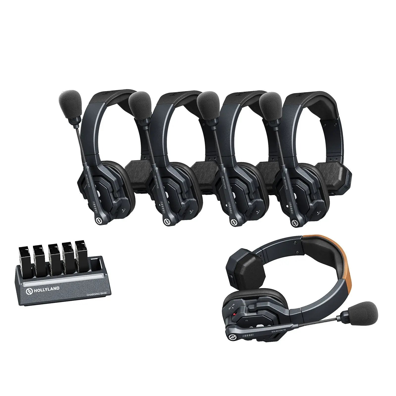 The Hollyland Solidcom SE is a reliable 2.4 GHz full-duplex wireless intercom system designed for small production teams seeking crystal-clear communication and portability. With advanced dual-mic ENC 1100ft range auto frequency hopping and water/wind resistance it’s ideal for video shoots events and outdoor productions. Lightweight and easy to use straight out of the box the Solidcom SE offers hassle-free operation with long battery life and comfortable headsets. Full-duplex 5-person wireless intercom system 2.4GHz global frequency with auto frequency hopping Dual-mic ENC for enhanced voice clarity Up to 1100ft (350m) LOS transmission range Pre-paired out of the box for quick deployment PTT and flip-up mic mute functionality Detachable battery design with USB-C charging Wind and water resistant – perfect for outdoor use Super lightweight single-ear headsets (~185g with battery) What's in the Box: 1× Master Headset 4× Remote Headsets 10× Batteries 2× Dual-Port USB-C Chargers 5× Over-ear Leather Cushions 5× On-ear Foam Cushions 5× Microphone Cushions 5× Headset Bags 1× Storage Case 1× Quick Guide 1× Warranty Card