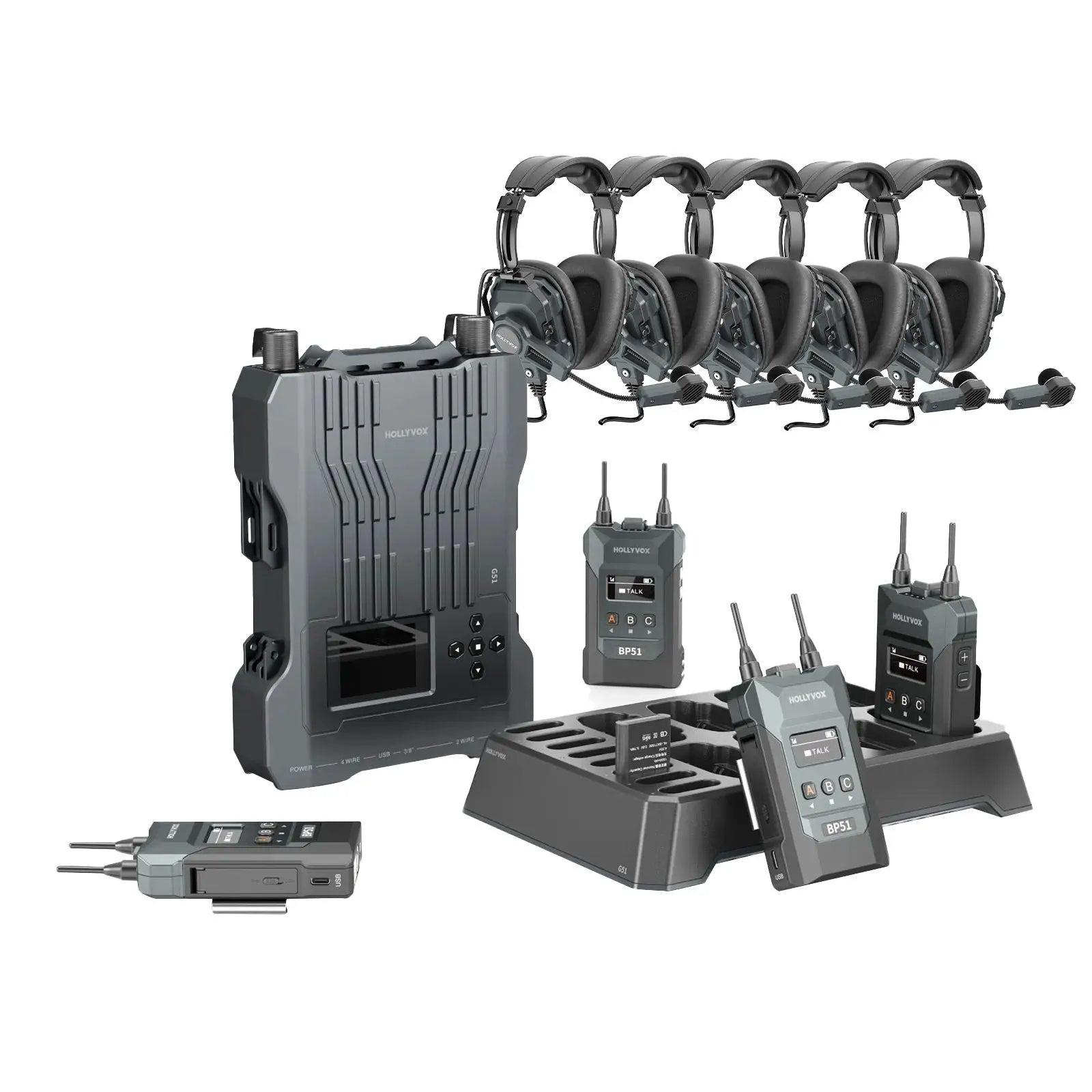 The G51 5-Way Double-Sided Comms System includes five full-duplex DECT intercom headsets with double-sided environmental noise cancellation. Ideal for small production teams it offers crystal-clear communication up to 350ft LOS plug-and-play functionality and robust headset control. Delivered with base stations for reliable power and operation. Includes 5 double-sided intercom headset units with dual-mic ENC Full-duplex wireless communication using 2.4GHz DECT 5-way team comms support Pre-paired for instant deployment Metal base stations included for headset power/control Up to 350ft (110m) LOS signal range PTT and flip-up mic mute per headset Powered via base stations (no batteries) Includes: 5× Double-sided headsets 5× Base Stations 5× Power Adapters 5× Headset Cushions 1× Carry Case 1× User Manual