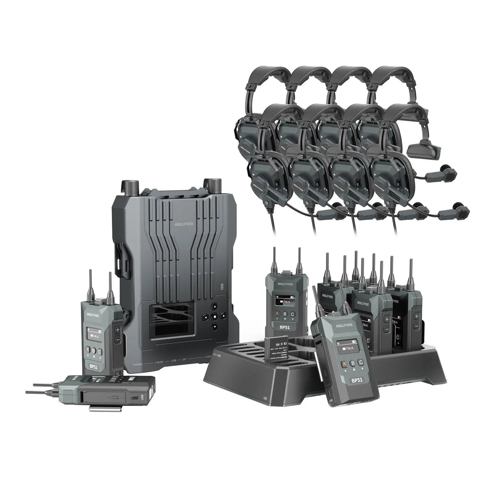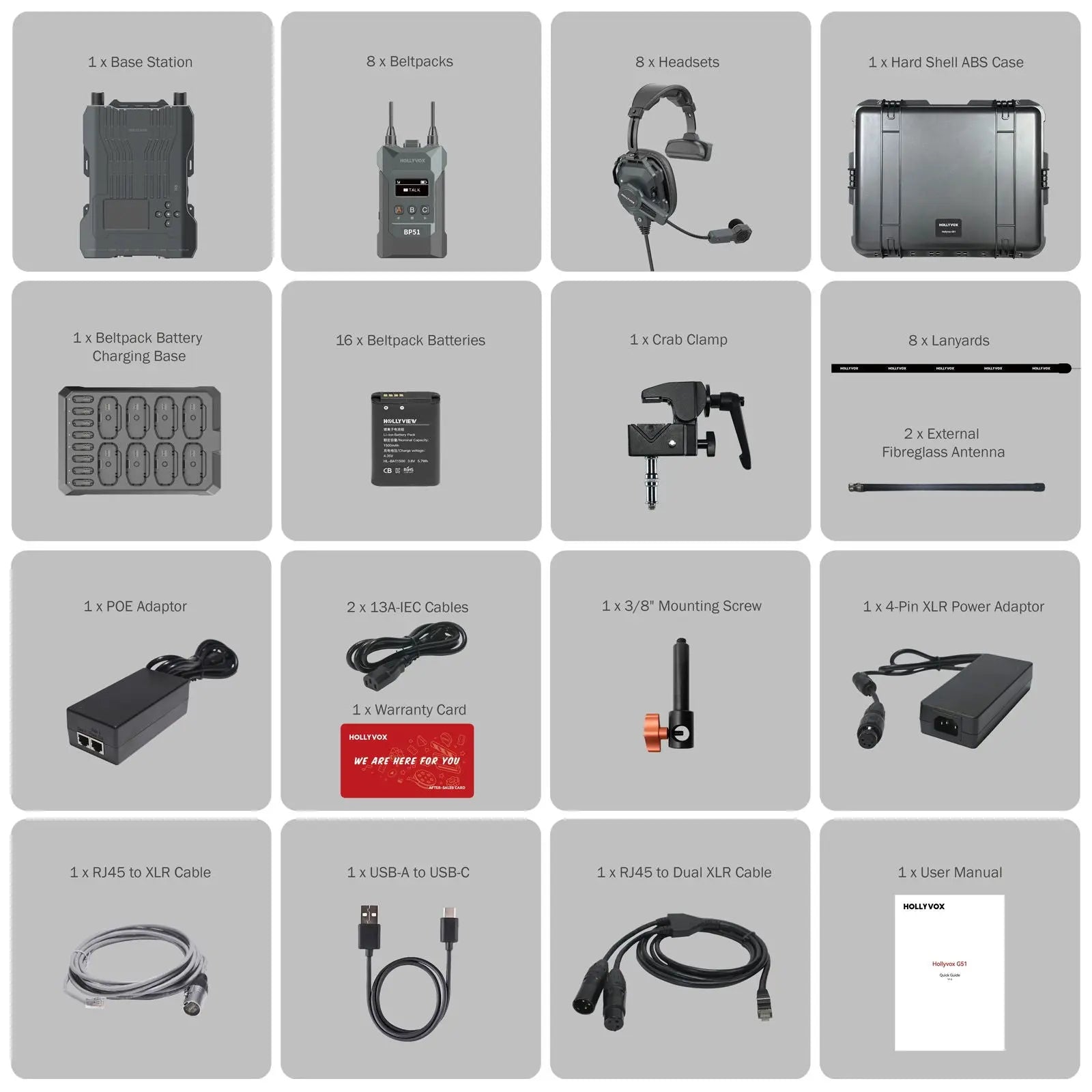 Introducing Hollyvox G51 the ultimate full-duplex wireless intercom system recognized for its unparalleled professional performance. With advanced dual-mic Environmental Noise Cancellation (ENC) technology this system ensures unparalleled communication clarity ideal for production teams working in loud environments. The ergonomic headset design offers optimal stability and comfort allowing you to stay focused on your tasks. With an impressive line of sight range of 1300ft (400m) it is the ideal choice for small and medium applications such as stage performances and sports events enabling seamless team coordination through extensive and interference-free communication. Dual microphone electronic noise cancelling 1300ft (400m) communication range Enhanced audio quality Grouping talk for up to three talk groups App and Webpage configuration 1.9GHz operating frequency Cozy fit headsets System includes a heavy duty utility case with foam inserts which features pressure relief valves ready for international travel waterproof o-ring seal between lid and base safety lock latches and ID slot Contents: 1 x RU51 Intercom System 8 x Headsets 8 x BP51 Wireless Intercom Beltpacks 1 x Beltpack Battery Charging Base 2 x External Fibreglass Antenna 16 x BP51 Beltpack Batteries 1 x 4-Pin XLR Power Adaptor 4 x Lanyards 1 x POE Adaptor 1 x 3/8" Mounting Screw 1 x RU51 Crab Clamp 1 x RJ45 to Dual XLR Cable 1 x Hard Shell ABS Case 1 x RJ45 to XLR Cable 2 x 13A-IEC Cables 1 x USB-A to USB-C Cable 1 x Heavy duty utility case 1 x User Manual and 1 x Warranty Card