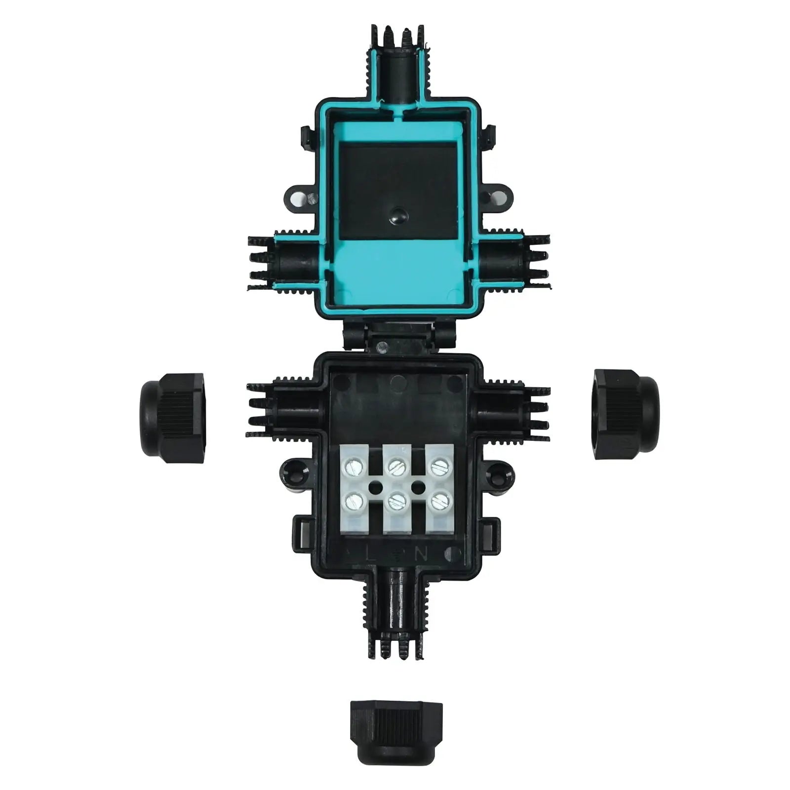 The THK200C2EF is a 3-way Junction Box / splitter suitable for internal or external uses. Accepting cables from 4 to 9.5mm diameter the handy T shaped box supplied complete with three pole terminal block. The connection hinge between the top and the bottom simplifies the installation process. TeeBox 3 cable entries IP67 16A rated Screw terminals 3 sizes of gasket supplied (Cable sizes: 4-5.5mm 5.5-7mm 7-9.5mm). Blanking plug to allow a 2 cable connection. Closing screws plus 2 Fixing screws with wall plugs. Comprehensive range of connection options Protection rating up to IP68 depending on product Unique 3 pole T connector TH029 available for use in TH209 & TH211 range no cable forming required TH211 available as full KIT version complete with TH029 fitted Power distribution products available in 3 port (TH630) and 4 port (TH62) versions Temperature range of –20°C to +125°C/li>