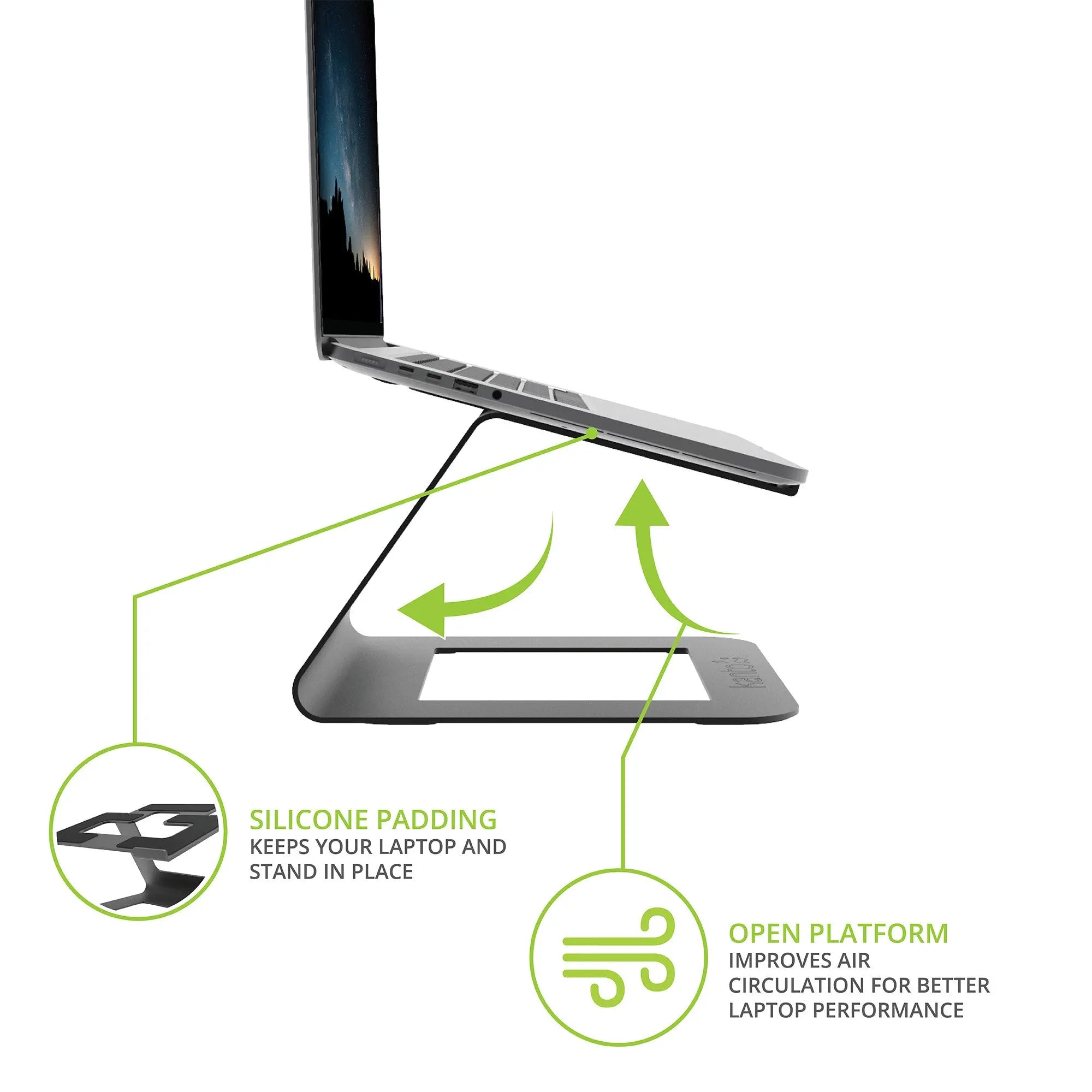 Non-Slip Security: Features high-grip silicone strategically placed on both the laptop platform and the base. This ensures your laptop remains secure and stable while you work, providing peace of mind.