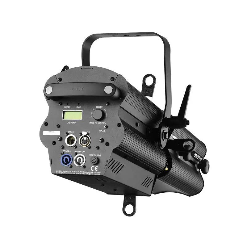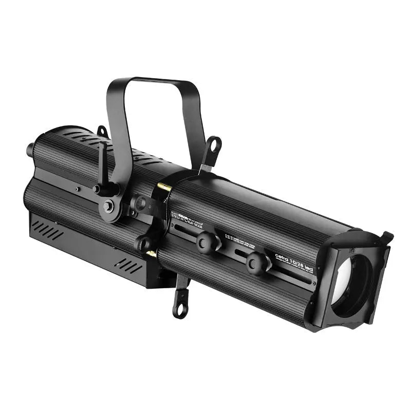 A compact and high efficiency 100W LED narrow angle profile spotlight featuring double-condenser optics and a PWM dimming power source. The Cetra is ideal in all applications where heat and energy saving are of a concern. A full range of accessories complements the range. 1 x 89W white LED (3200K) Beam style: Well defined flat-field profile projection Adjustable beam angle: 10°- 28° 10° - 11250 Lux @ 2m 28° 4500 Lux @ 2m Focus adjustment: Slide zoom controls on side (diameter and softness) Beam shaping: 4 shutter blades supplied and optional iris diaphragm CRI > 90 LED frequency control for TV cameras ranging from 460Hz to 3kHz Manually selectable from rear panel or remotely controlled through DMX Optical system: Double condenser with variable zoom DMX channels: 1/2/3 or 4 selectable 0 - 100% 8 or 16 bit dimming PWM (Pulse Width Modulation) 4 dimming curves: Linear square LED-HAL and user defined 125 x 125mm gel frame included Mounting bracket LCD display Neutrik powerCON input/output powerCON cable to bare ends included 5-Pin XLR input/output Construction: Extruded aluminium and sheet steel