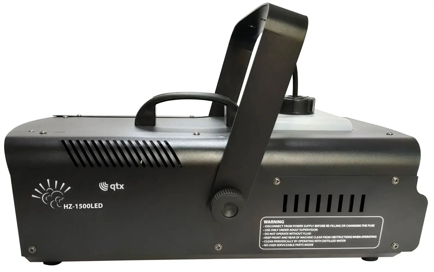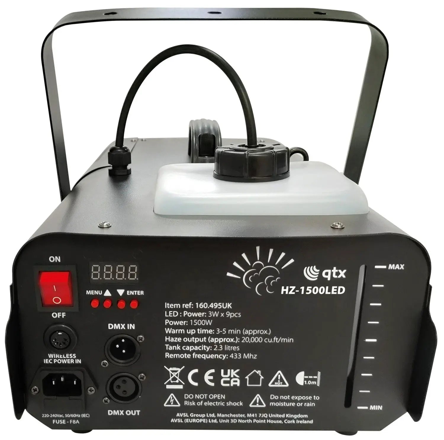 A high efficiency 1500W haze machine capable of producing 20000 cu.ft per minute of haze to rapidly fill larger venues. The haze effect can then be highlighted with an array of colours from the 9 bright LEDs housed in the front of the unit. The haze and light effects are easily controlled using either the included keyfob-style RF wireless remote or by 6-channel DMX connection. The 2.3 litre fluid bottle can be removed for easy refilling and there is a slot window to indicate the current fluid level. 1500W haze vaporizer with around 20000 cu.ftmin output Nine powerful 3W LEDs add a bright colourful light show to the haze effect 433Mhz keyfob-style RF wireless remote 6-Channel DMX connections Removable 2.3 litre fluid tank High grade haze fluid should be used with this machine (we recommend 160.591UK)