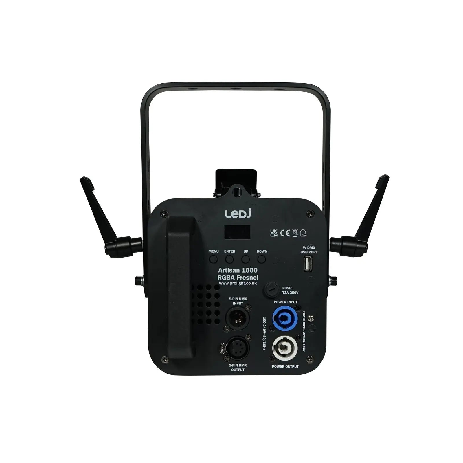 The Artisan 1000 RGBA Fresnel with a 100W quad-colour COB LED is ideal for schools churches and stages and making it an ideal replacement for tungsten fixtures. The beam angle is manually adjustable with all other features being controllable via the 4 button menu and OLED display or by DMX. The USB socket on the back panel allows for an optional W-DMX compatible transceiver further expanding the fixtures versatility with wireless master/slave or DMX control. 1 x 100W quad-colour COB LED (RGBA) Manually adjustable beam angle: 15°- 45° 15° - 9396 Lux @ 2m (full on) 45° - 1985 Lux @ 2m (full on) Refresh rate: 1.2kHz 2.4kHz 4kHz 6kHz or 10kHz selectable DMX channels: 4/5/6 or 8 selectable W-DMX USB compatibility for wireless master/slave or DMX control W-DMX USB can be used to receive wireless DMX and relay the DMX signal via the XLR output 0-100% dimming 4 dimming curves: Linear square law inverse square law and S-curve Variable strobe 4 button menu with OLED display powerCON input/output 5-Pin XLR input/output Temperature controlled fan for whisper quiet operation Handle on rear panel Filter frame and barn doors included