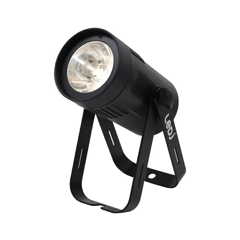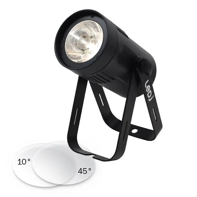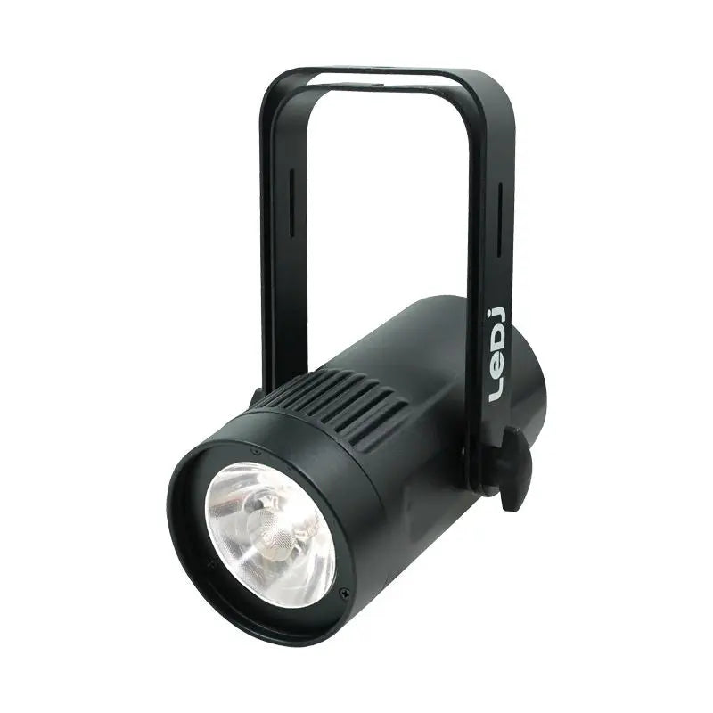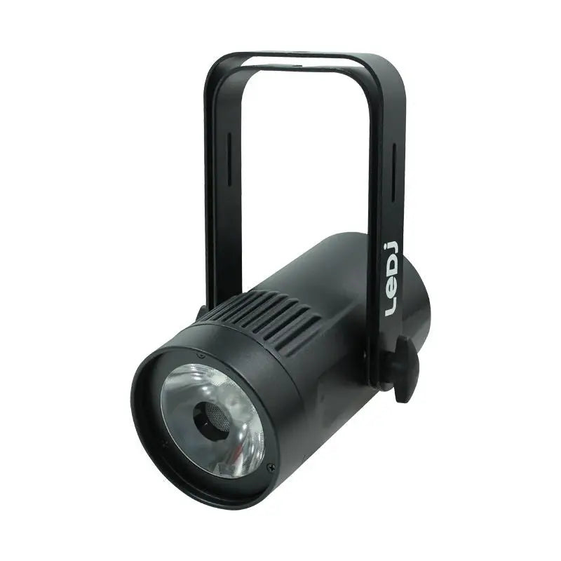 The Event Spot compact LED Pinspots are powered by a 15W LED that has the brightness and output of a 100W halogen lamp. Featuring a 4° beam angle and supplied with two optional lenses (10° and 45°) the fixture is easily directed at displays for highlighting and pinspotting it can also be used to create mood lighting on restaurant tables or to spotlight displays in store. 1 x 15W day light LED (5000K) Beam angle: 4° native 10° and 45° frost lenses supplied 4°- 13640 Lux @ 2m 10°- 7109 Lux @ 2m 45°- 786 Lux @ 2m Refresh rate: 1.1kHz DMX channels: 1 or 2 selectable Manual and master/slave modes 0 - 100% dimming Variable strobe Bracket allows for multiple rigging or floor standing applications 4 button menu with LCD display powerCON input/output 3-Pin XLR input/output trailing connections Convection cooled Optional IR remote (LEDJ90E)