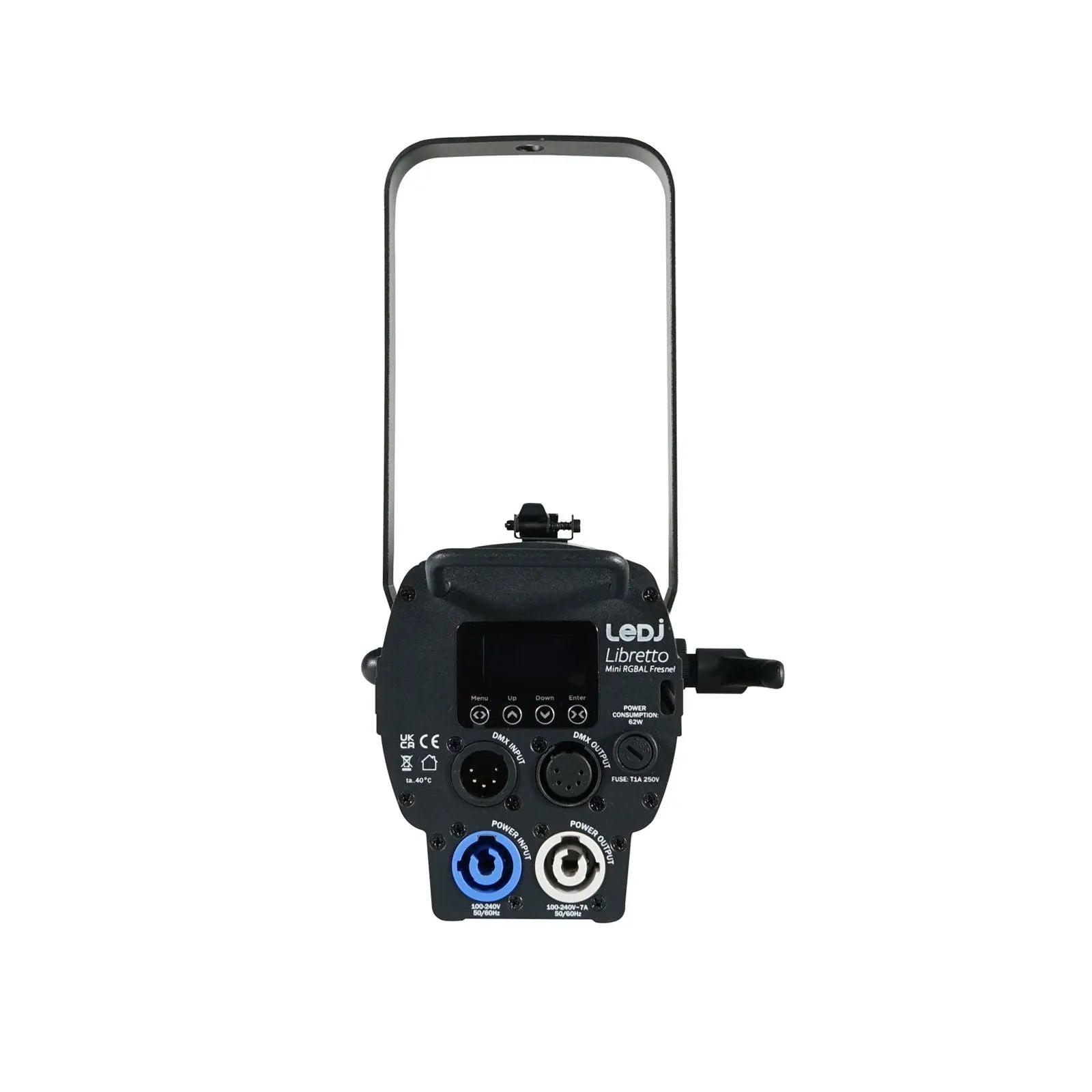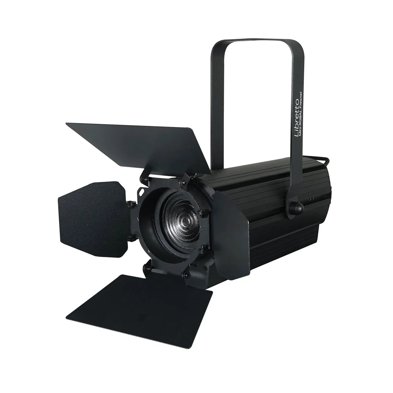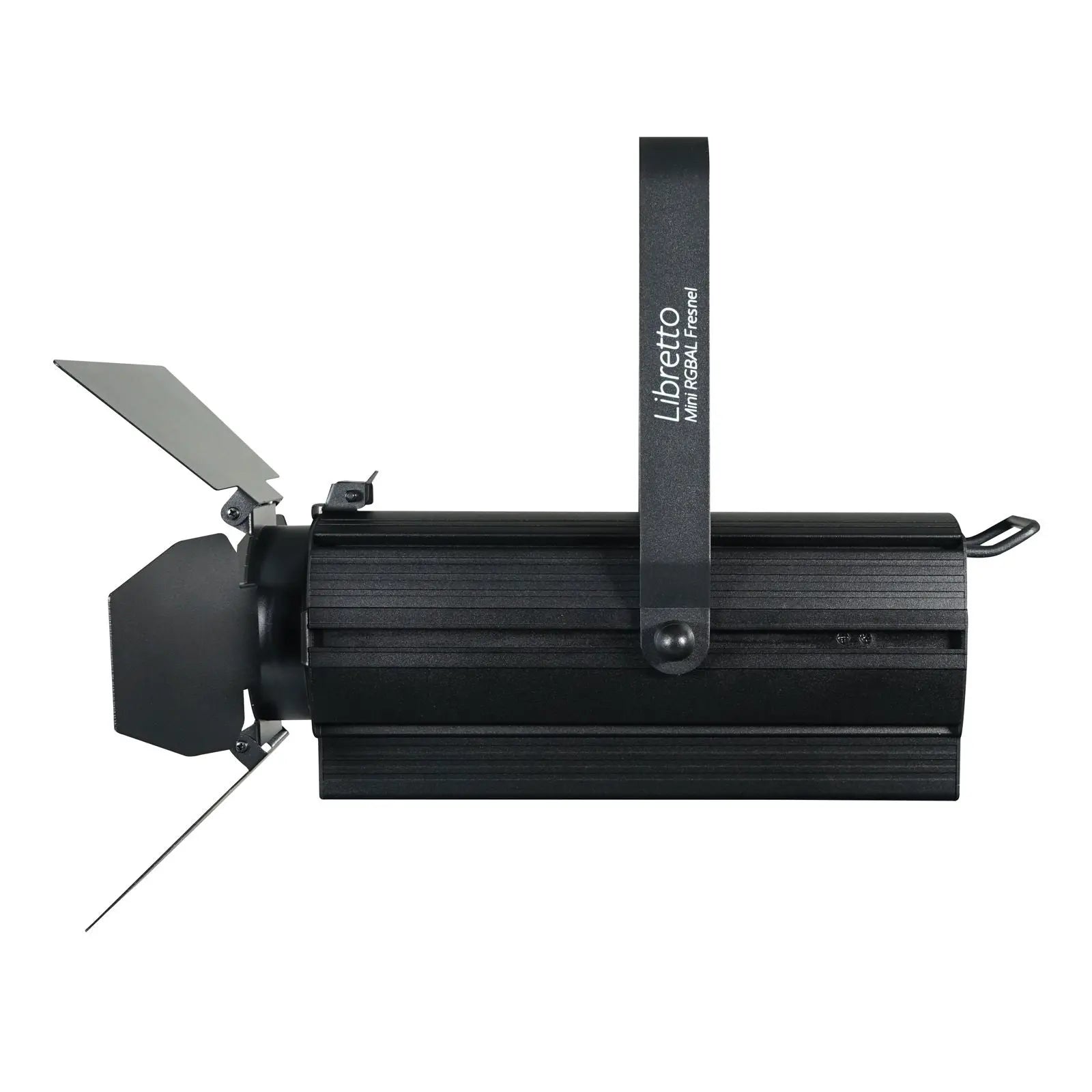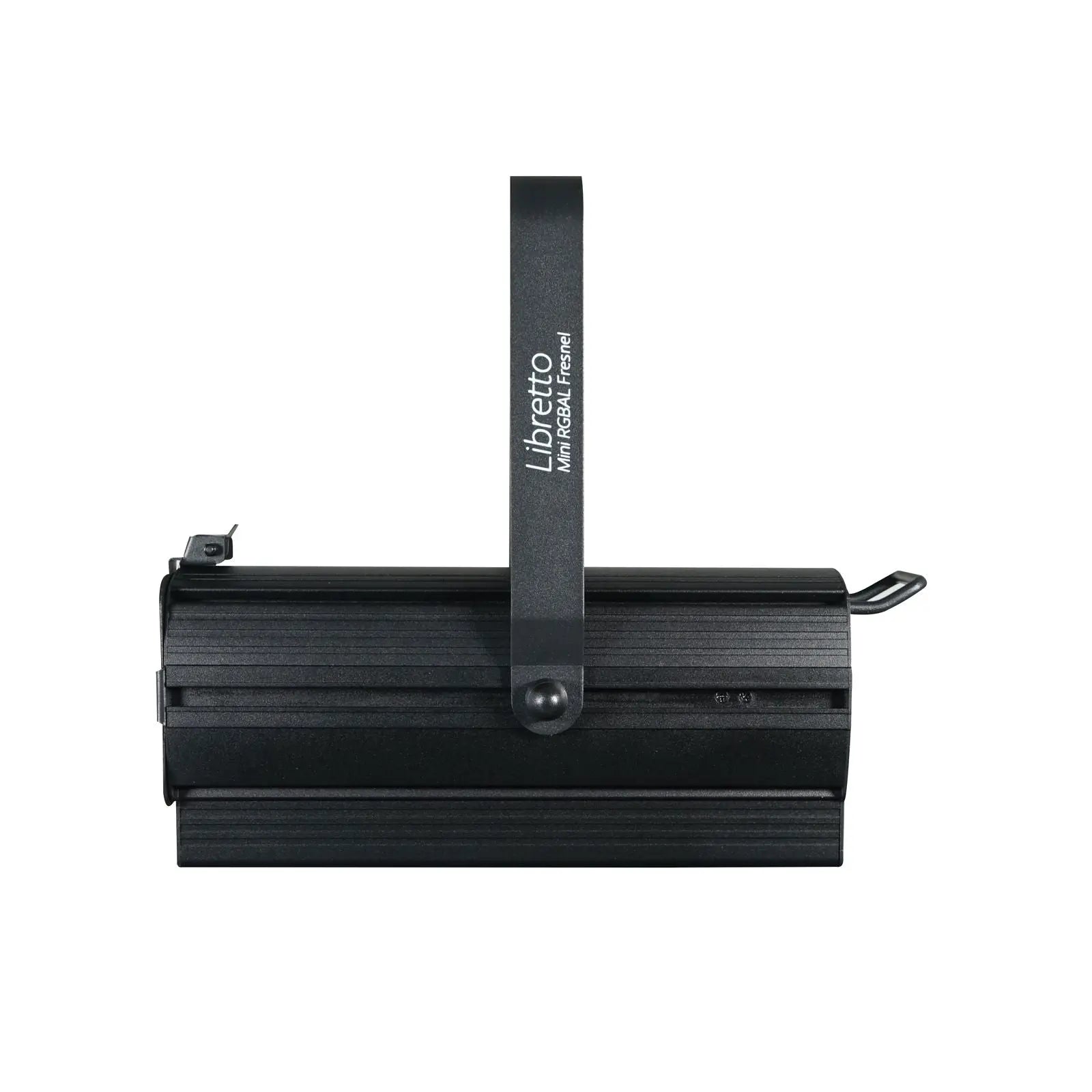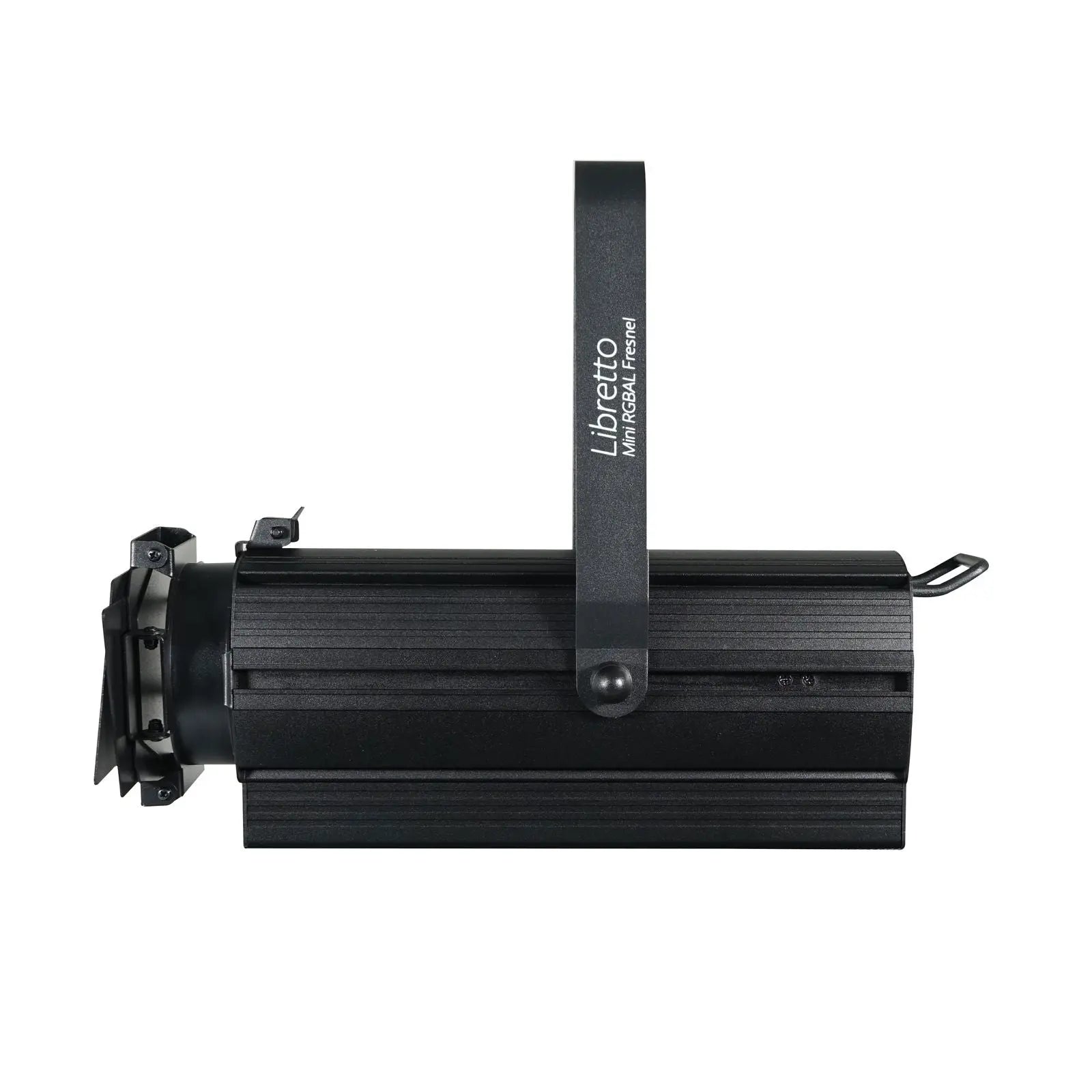 The Libretto RGBAL is a 60W five-colour COB LED Fresnel with a high CRI. This lightweight compact fixture comes supplied with barn doors and is suited to gallery museum and theatre applications. It features a manually adjustable beam angle from 17° to 34° and control is via both DMX and the on-board menu which allows access to the manual dimming modes along with dimming curves. 1 x 60W five-colour COB LED (RGBAL) Manually adjustable beam angle: 17° - 34° 17° - 1849 Lux @ 2m 34° - 749 Lux @ 2m Refresh rate: 900Hz 1000Hz 1200Hz 1500Hz 2500Hz 4000Hz 5000Hz 10KHz 15KHz or 20KHz selectable CRI: 93 DMX channels: 2/3/5/7/9 or 13 selectable Auto static colour and manual modes 0-100% dimming 4 dimming curves: Linear square law inverse square law and S-curve Variable strobe 4 button menu with OLED display powerCON input/output 5-Pin XLR input/output Fan cooled Rear positioning handle Filter frame and barn doors included