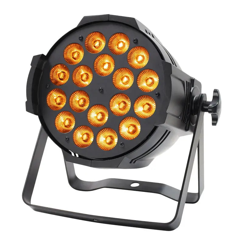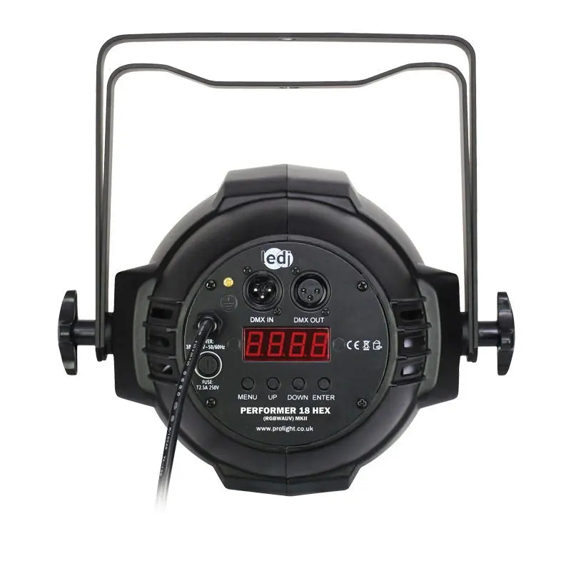 The Alu Performer Par HEX has 18 x 12W six-colour LEDs punching out astonishing levels of colour ideal for uplighting in large venues general stage wash and illumination. This fixture offers superior performance in a robust yet lightweight cast aluminium housing and features a simple to operate 4 button menu that allows users to select several operation modes. 18 x 12W six-colour LEDs (RGBWAUV) Beam angle: 40° 3343 Lux @ 2m (full on) 2kHz refresh rate DMX channels: 6 or 10 selectable Static colour colour fade colour change auto run sound active and master/slave modes 0 - 100% dimming Variable strobe Bracket allows for multiple rigging and floor standing applications 4 button menu with LED display Captive power connection 3-Pin XLR input/output Fan cooled