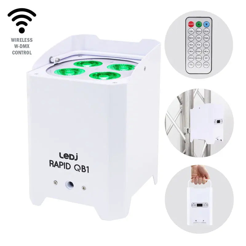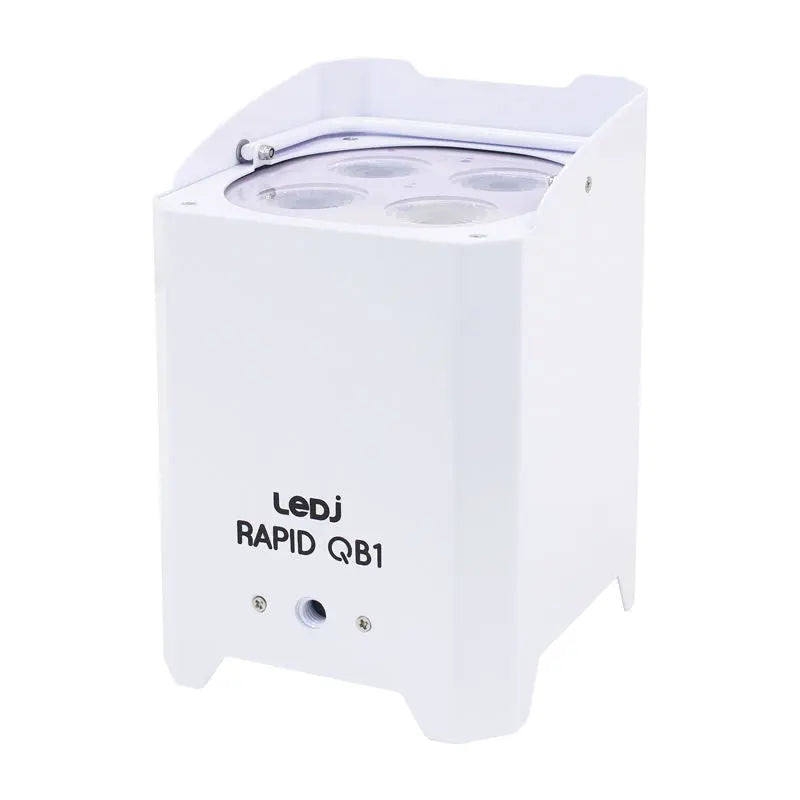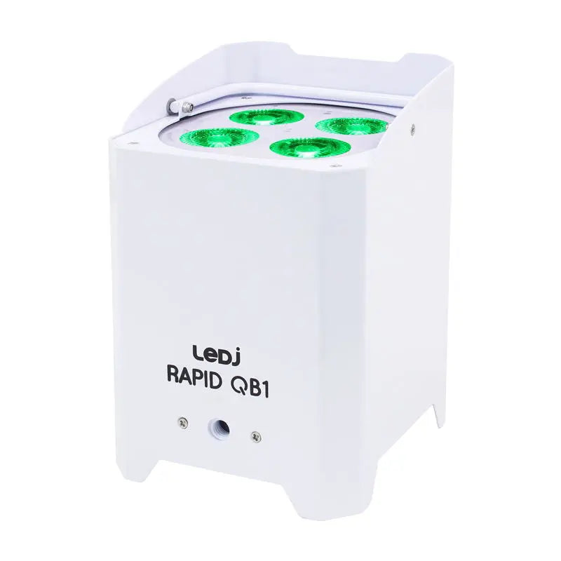 Rapid QB1 RGBA IP is a portable battery powered uplighter outputting ultra-smooth colours from rich saturated hues to subtle pastel shades. The temporary outdoor rated compact and robust housing repels water snow and dirt for all-weather applications and is easily concealable. The internal lithium battery has autonomy of up to 18 hours in single colour mode and up to 8 hours of colour fading and chases while the charging time is only 5 hours. The fixture is IP54 rated (IP65 from the top) has a powerCON TRUE1 input and features an extractable foot that allows users to adjust the tilt angle. The on-board wireless transceiver and W-DMX compatibility make for a truly cable free operation. 4 x 8W quad-colour LEDs (RGBA) Beam angle: 15° (field angle: 29°) 1551 Lux @ 2m Refresh rate: 1.2kHz DMX channels: 4/6 or 10 selectable Wireless control (W-DMX Sweden compatible transceiver) Static colour colour change colour fade auto and master/slave modes 0 - 100% dimming Variable strobe M10 rigging point for clamp Adjustable foot support for angled floor standing applications (up to 25°) Carry handle for transportation Safety bond/security chain point 4 button menu with OLED display Rechargeable battery for wireless applications Maximum run time: up to 18 hours (single colour) 8 hours (colour change/fade) 4 hours (full on) Charging time: 5 hours (max.) powerCON TRUE1 input Convection cooled Supplied with IR remote
