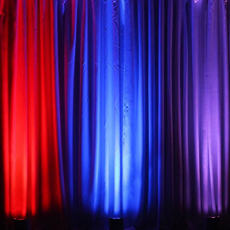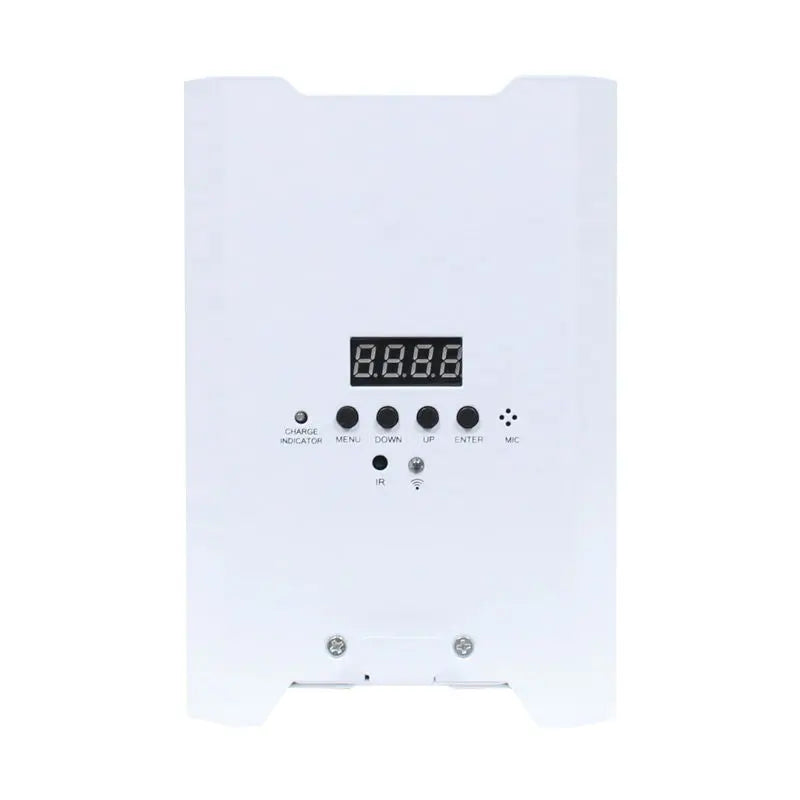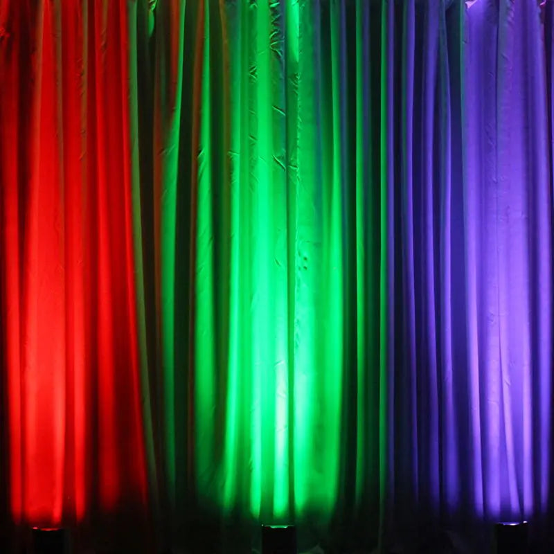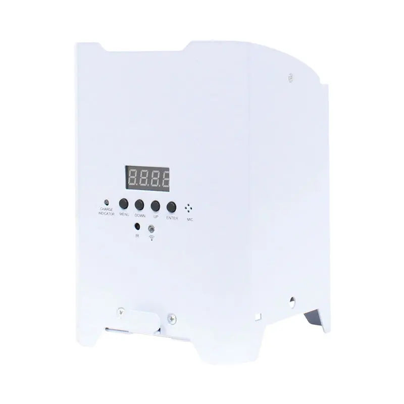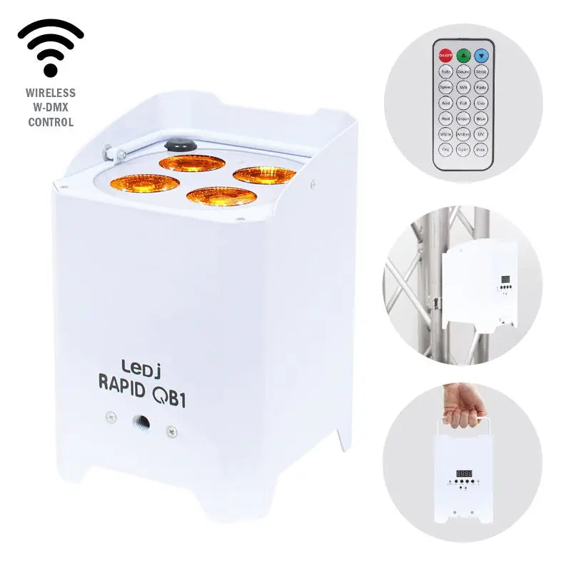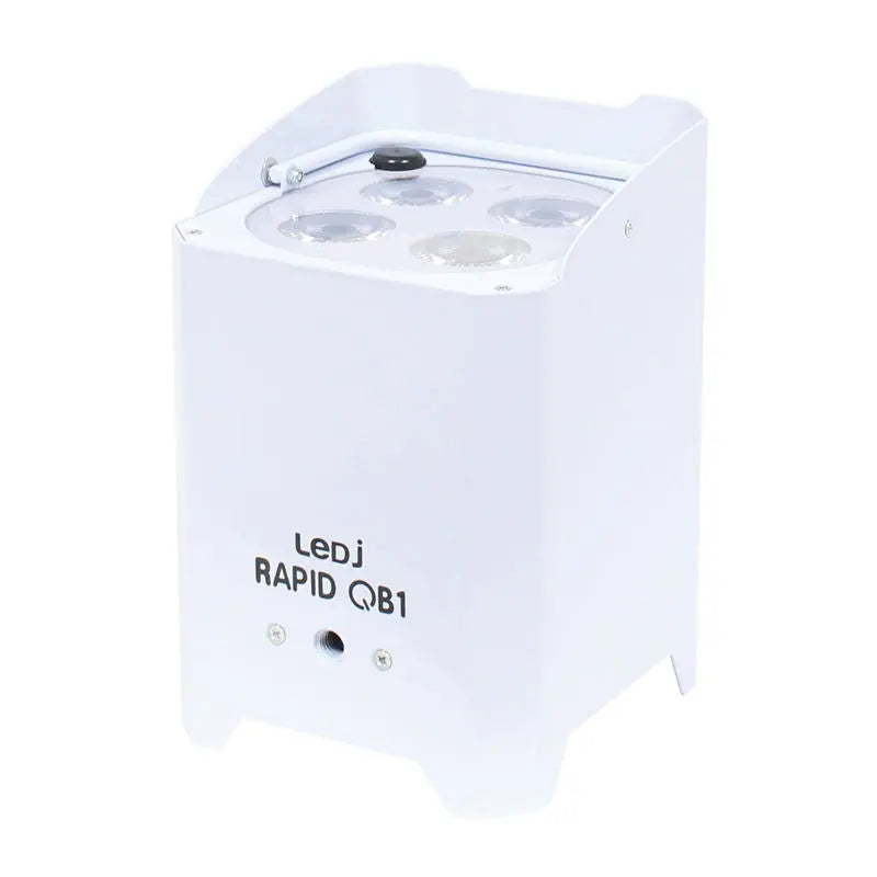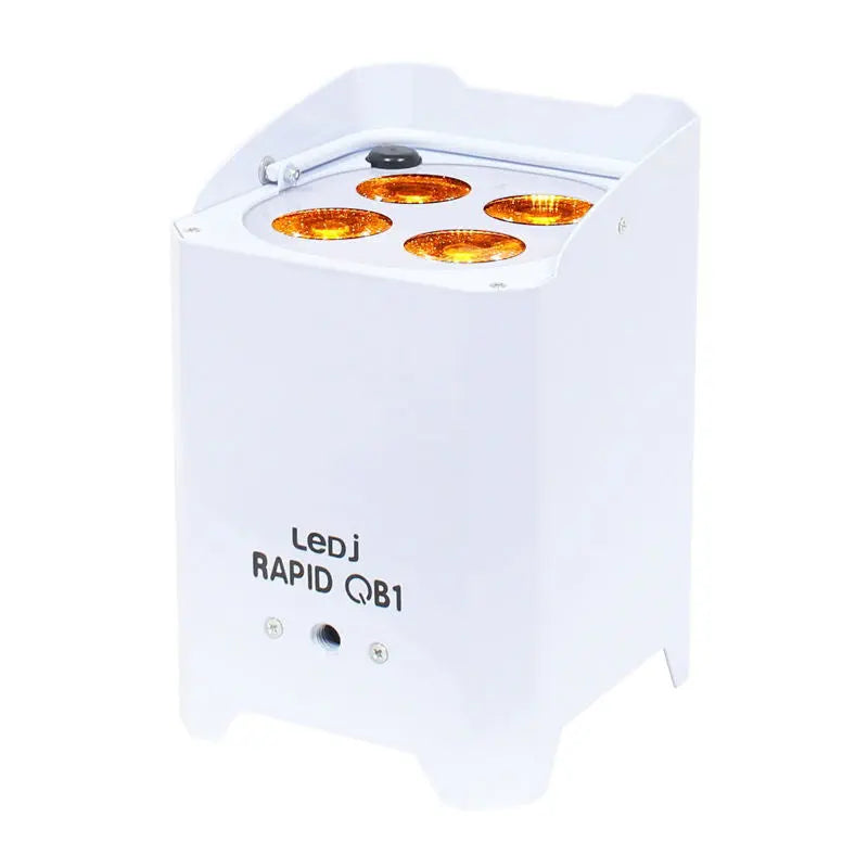 Rapid QB1 RGBA is a portable battery powered uplighter outputting ultra-smooth colours from rich saturated hues to subtle pastel shades. The compact and robust housing design makes this fixture extremely portable and easily concealable. The internal lithium battery has autonomy of up to 18 hours in single colour mode and up to 8 hours of colour fading and chases while the charging time is only 5 hours. The light source is composed of 4 x 8W high-power RGBA LEDs and the extractable foot allows you to adjust the tilt angle. The on-board wireless transceiver makes for a truly cable free operation and is W-DMX compatible. 4 x 8W quad-colour LEDs (RGBA) Beam angle: 15° (field angle: 29°) 1551 Lux @ 2m Refresh rate: 1.2kHz DMX channels: 4/6 or 11 selectable Wireless control (W-DMX Sweden compatible transceiver) Static colour colour change colour fade auto sound active and master/slave modes 0 - 100% dimming Variable strobe M10 rigging point for clamp Adjustable foot support for angled floor standing applications (up to 25°) Carry handle for transportation Safety bond/security chain point 4 button menu with LED display Rechargeable battery for wireless applications Maximum run time: up to 18 hours (single colour) 8 hours (colour change/fade) 4 hours (full on) Charging time: 5 hours (max.) IEC power input/output 3-Pin XLR input/output Convection cooled Supplied with IR remote