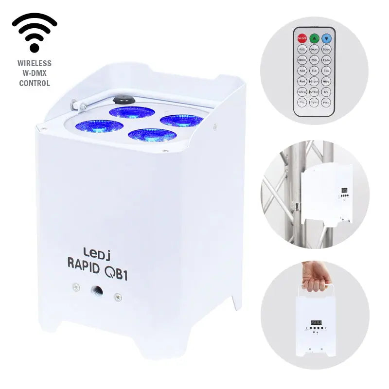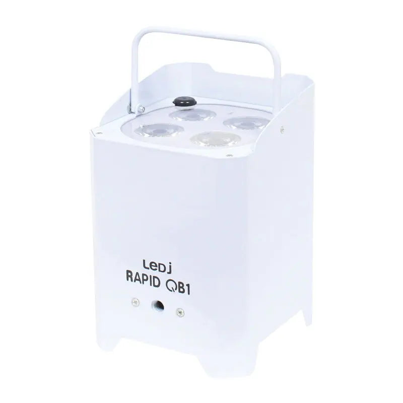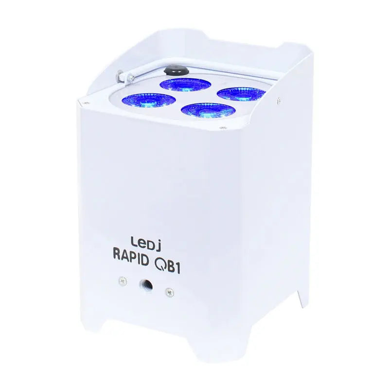 Rapid QB1 RGBW is a portable battery powered uplighter outputting ultra-smooth colours from rich saturated hues to subtle pastel shades. The compact and robust housing design makes this fixture extremely portable and easily concealable. The internal lithium battery has autonomy of up to 18 hours in single colour mode and up to 8 hours of colour fading and chases while the charging time is only 5 hours. The light source is composed of 4 x 8W high-power RGBW LEDs and the extractable foot allows you to adjust the tilt angle. The on-board wireless transceiver makes for a truly cable free operation and is W-DMX compatible. 4 x 8W quad-colour LEDs (RGBW) Beam angle: 15° (field angle: 29°) 1954 Lux @ 2m Refresh rate: 1.2kHz DMX channels: 4/6 or 10 selectable Wireless control (W-DMX Sweden compatible transceiver) Static colour colour change colour fade auto sound active and master/slave modes 0 - 100% dimming Variable strobe M10 rigging point for clamp Adjustable foot support for angled floor standing applications (up to 25°) Carry handle for transportation Safety bond/security chain point 4 button menu with LED display Rechargeable battery for wireless applications Maximum run time: up to 18 hours (single colour) 8 hours (colour change/fade) 4 hours (full on) Charging time: 5 hours (max.) IEC power input/output 3-Pin XLR input/output Convection cooled Supplied with IR remote