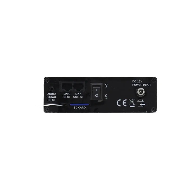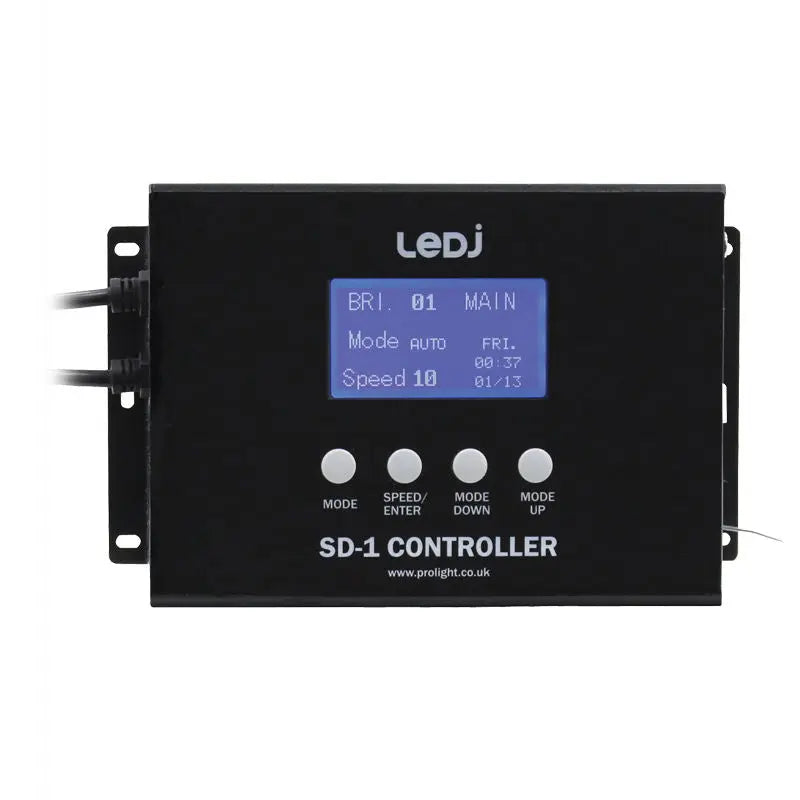 The SD-1 is a dedicated controller for the Display Qube and Display Floor fixtures. Features include 82 programs with auto run and 18 speed settings master/slave mode for multiple fixture linking sound active with sensitivity adjustment brightness and DMX modes. DMX channels: 12 Auto shows sound active and master/slave modes 4 push button menu with LCD display DC 12V power input 3-Pin XLR input/output trailing connections RJ45 link input/output 8 x RJ45 zone outputs 3.5mm jack audio source input SD card slot for floor configuration Wireless remote included