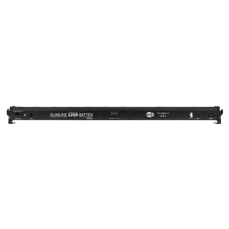 Housing 12 x 5W quad-colour LEDs the ultra bright Slimline 12Q5 batten gives smooth colour mixing from rich saturated hues to subtle pastel shades. Just like the other fixtures in the Q5 series these units have a rugged metal housing and a variety of operational modes. The fixtures are also convection cooled for silent operation. The Slimline 12Q5 batten is the next generation of our ever-popular Q5 series all of which are compatible giving you the option to link together a variety of units from the 12Q5 and 7Q5 ranges. These can then be easily operated via the optional IR remote creating a fully synchronised lightshow. 12 x 5W quad-colour LEDs (RGBA) Beam angle: 25° (field angle: 40°) 25° - 2166 Lux @ 2m Refresh rate: 400Hz DMX channels: 2/3/4 or 7 selectable Static colour colour change colour fade auto run sound active and master/slave modes 0 - 100% dimming Variable strobe Bracket allows for multiple rigging or floor standing applications 4 button menu with LCD display IEC power input/output 3-Pin XLR input/output Convection cooled Optional IR remote (LEDJ90C) Linkable with the Slimline 5Q5 and 7Q5