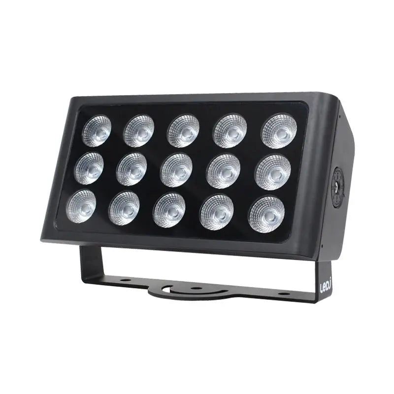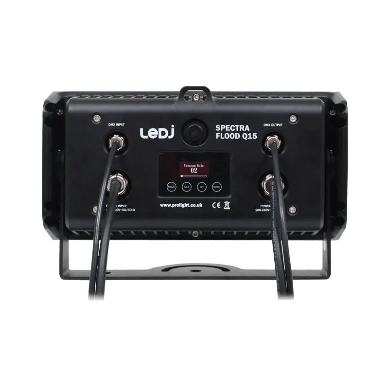 The LEDJ IP65 rated Spectra Q series bathes architectural details in constantly changing colours from its high output LEDs. The 45° beam angle smoothly washes in deep rich colours or warm pastel tones. The rugged aluminium exterior ensures years of use in most weather conditions while the integral mounting brackets complete the fixtures sleek modern appearance. The OLED display with 4 button menu facilitates control over colour mixing colour fades chases and DMX. 15 x 5W quad-colour LEDs (RGBW) Beam angle: 45° 1746 Lux @ 2m (full on) Refresh rate: 4kHz DMX channels: 4/6 or 9 selectable RDM (Remote Device Management) Static colour colour change colour fade auto and master/slave modes 0 - 100% dimming 4 dimming curves: Linear square law inverse square law and S-curve Variable strobe 4 button menu with OLED display Hydralock power input/output trailing connections Hydralock DMX input/output trailing connections Convection cooled