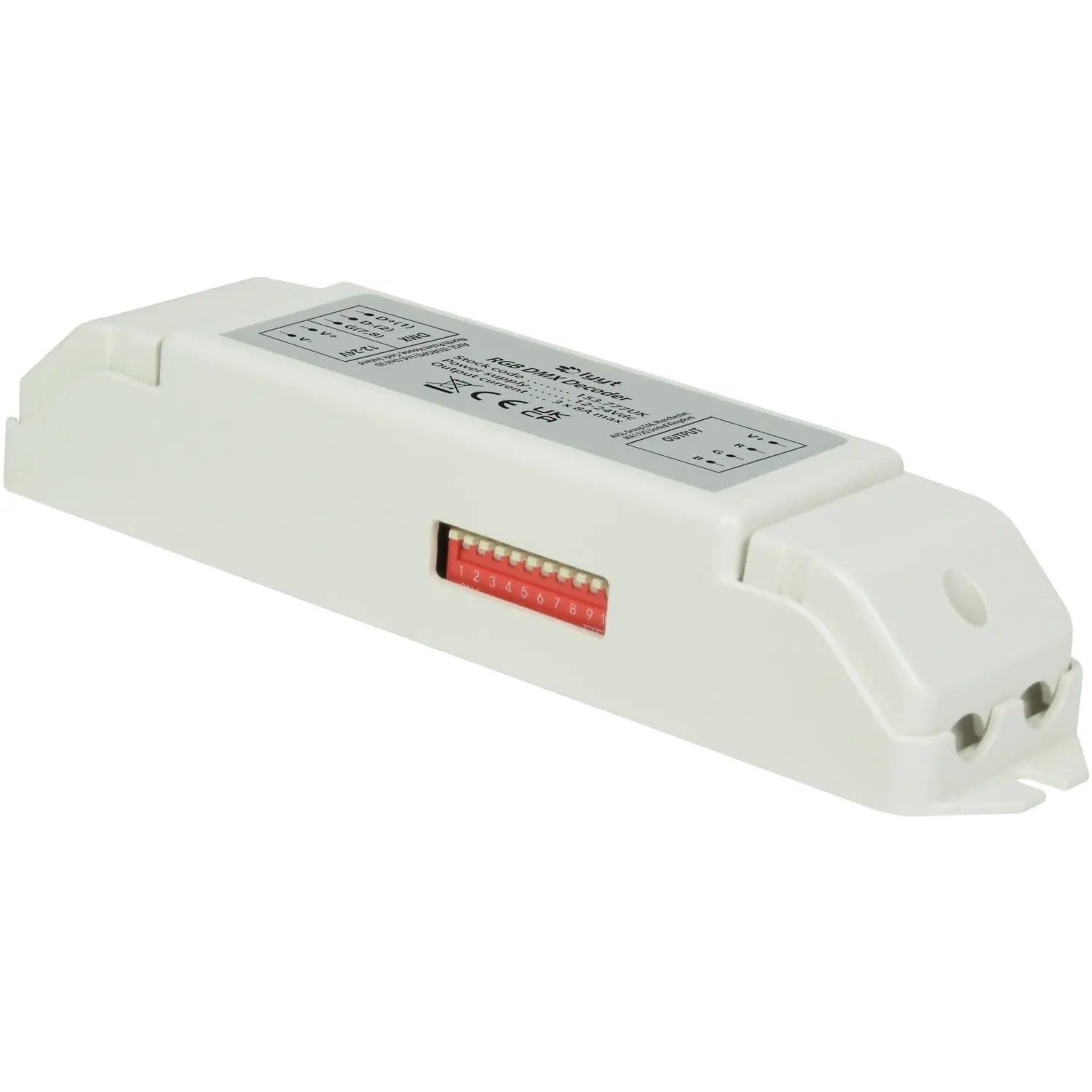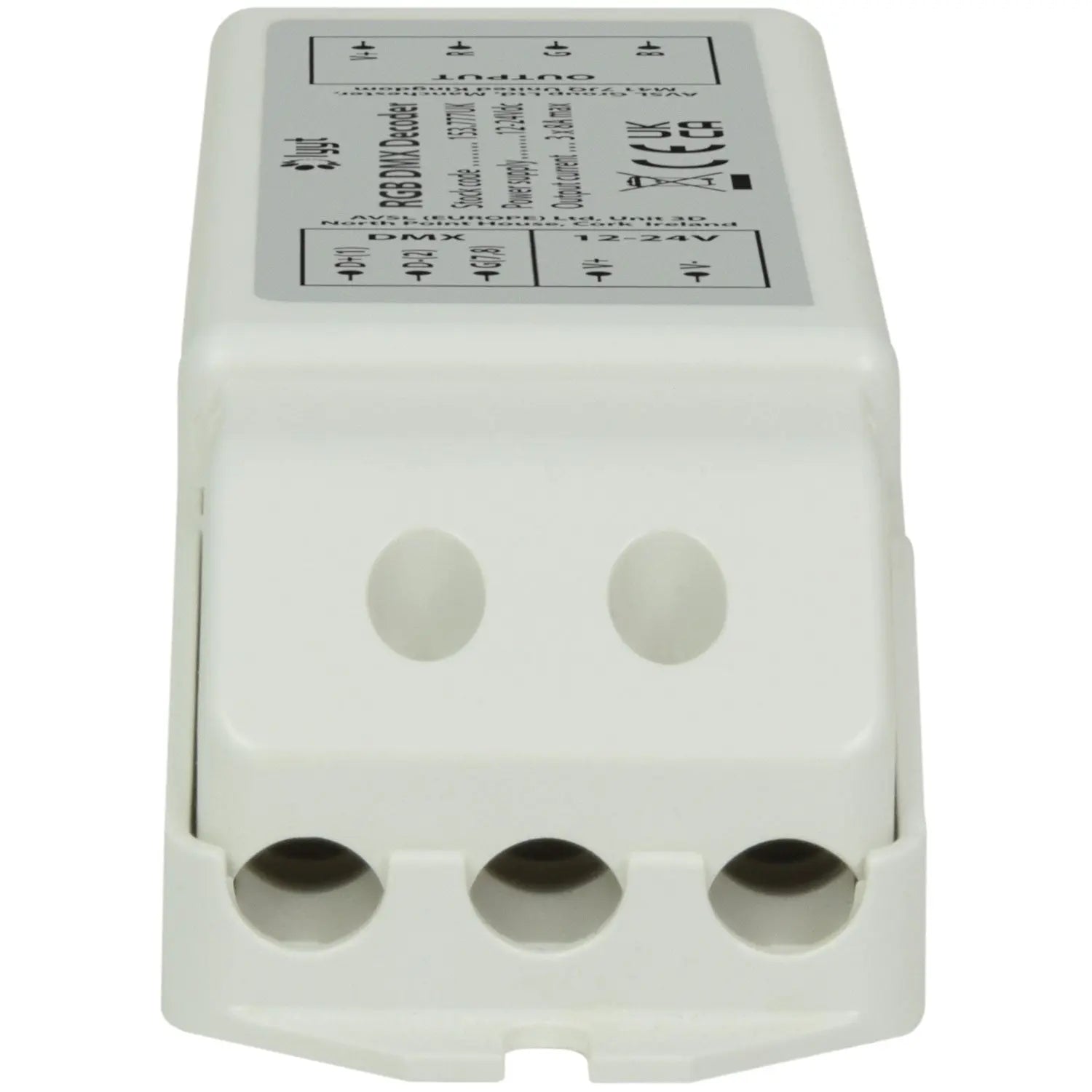 This DMX decoder is designed to convert the universal standard DMX512/1990 into analogue signal to control either 12V or 24V RGB LED tape. This model can drive 8A/channel and it simply assigns a colour per DMX channel. DC power input and colour channel outputs are connected via screw terminals. DMX input and through connection are also via screw terminals with the start address set by side mounted DIP switches. Powered by a 12V or 24V power supply, this decoder enables 3 channel DMX control of Red, Green and Blue output