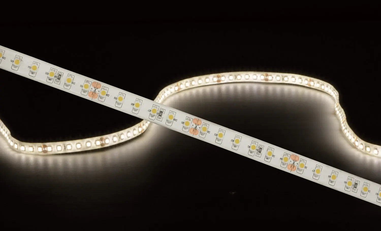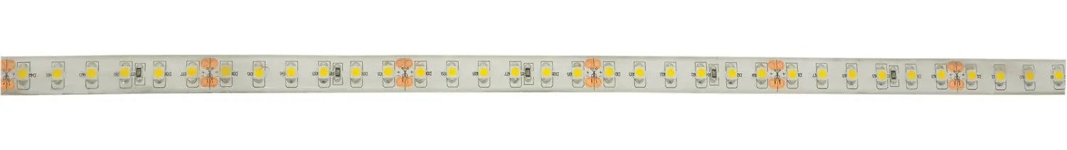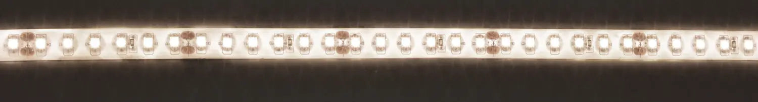 24V LED tape with high luminous flux output. 120 LEDs per metre combine to give exceptional light output with narrow spacing for even light distribution. Epoxy coated for water resistant protection and self adhesive backing for easy installation. Where standard LED tapes may not be powerful enough, these high output versions offer sufficient illumination for cabinets, architectural detail and signage.
