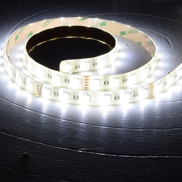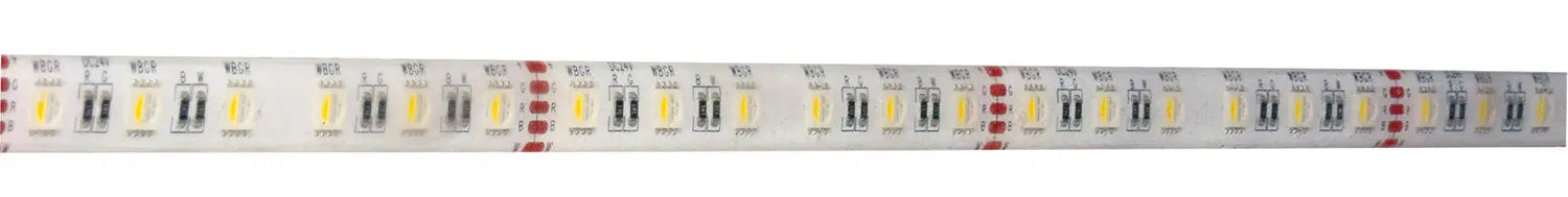 Super-bright IP65 rated RGBW LED tape which when connected to a controller can produce any colour of the rainbow. Supplied on 5m reel with an adhesive back this tape is easy to setup and quick to install. Its 24Vdc supply and low power consumption makes it suitable for a wide variety of applications from homes to vehicles and from shops to bars and nightclubs. The LEDs will last up to 50,000 hours and are covered with an epoxy coating to protect the tape from general wear and tear as well as being water resistant, making cleaning an easy task.