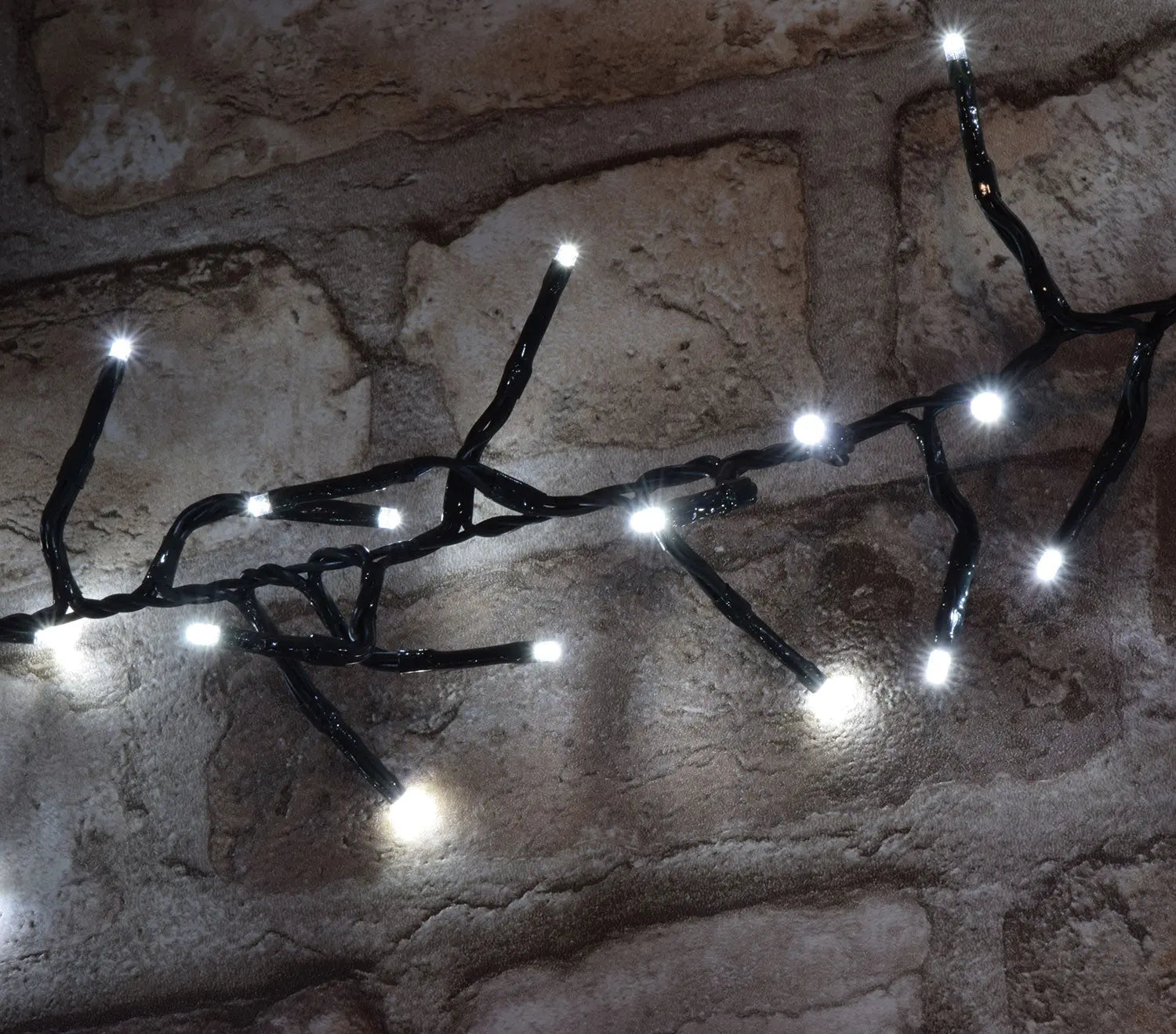 Versatile LED cluster string lights for the festive season, special events and atmospheric evenings all year round. Using the 8-programme button on the power adapter, you can switch through your desired lighting effect: Combo, Waves, Sequential, Slow Glow, Chase Flash, Slow Fade, Twinkle Flash and Steady ON. The lights also feature an energy-saving 8 hours on, 16 hours off timer function. The lights are 14m long with a dark green PVC cable and have a 5m power cable. These lights are IP44 rated and are suitable for indoor or sheltered outdoor use.