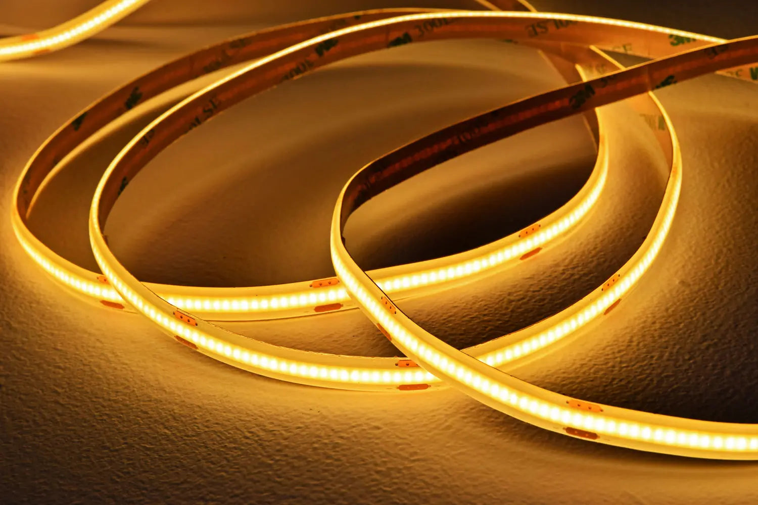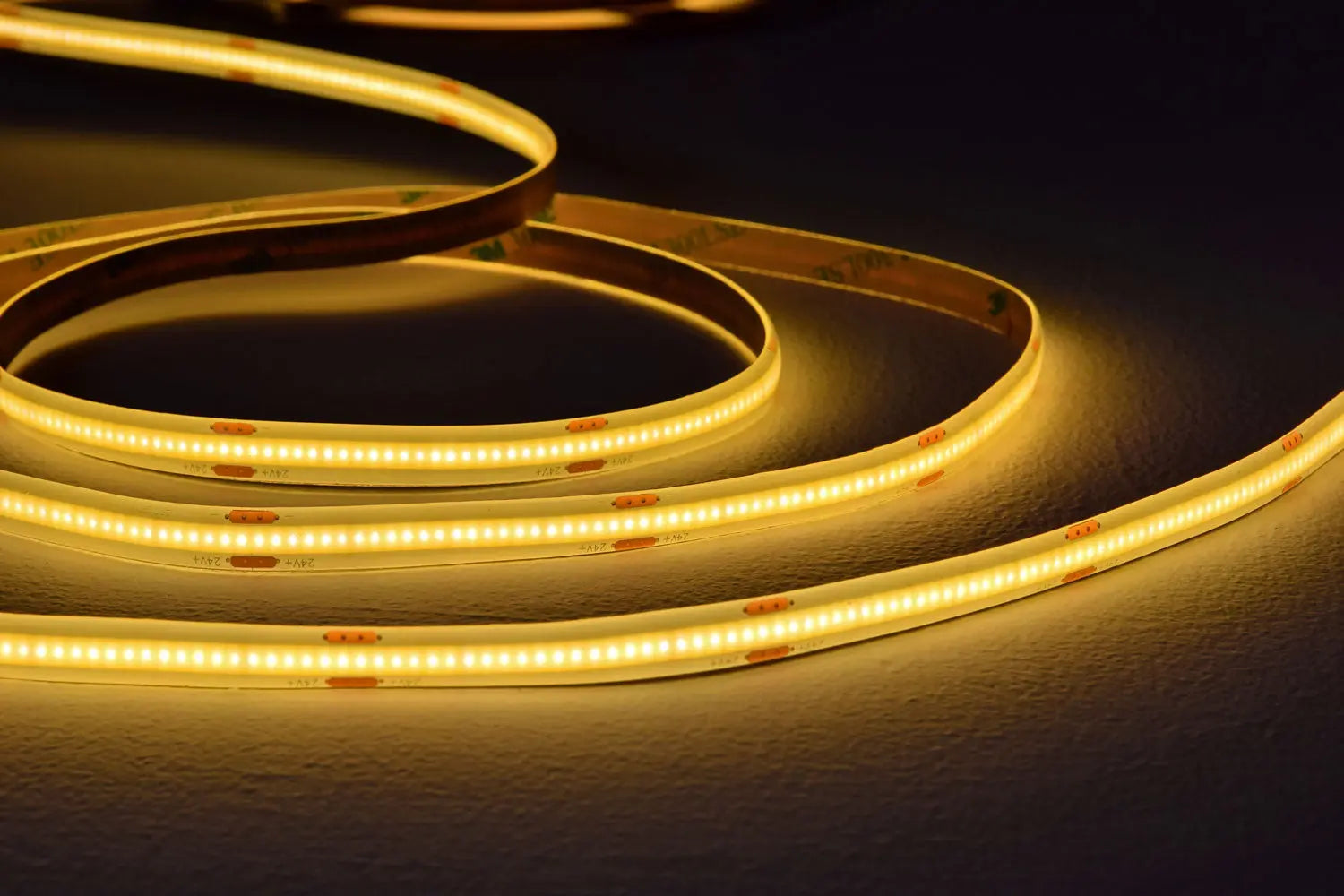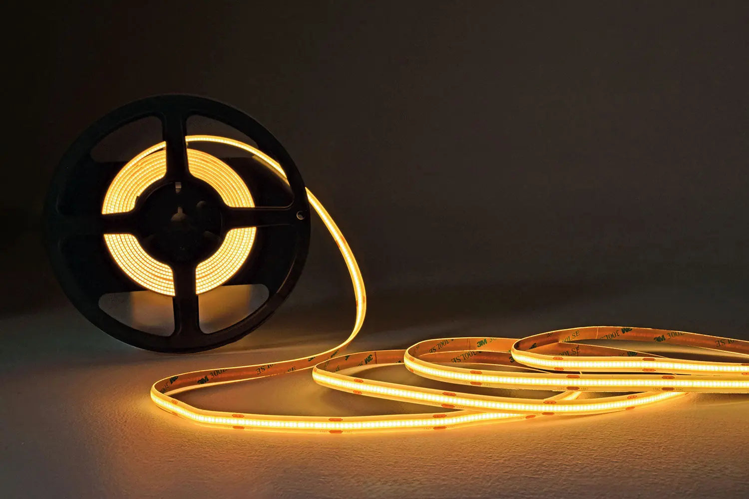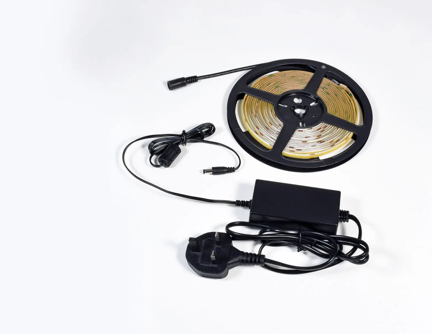 DIY Kit including 5m Seamless COB LED tape, power supply with UK adaptor. The tape is quick and easy to cut to size and install, with easy-peel self-adhesive backing. Low-voltage operation (24Vdc) with a seamless COB LED effect that eliminates ‘spots’ for an even distribution of light.