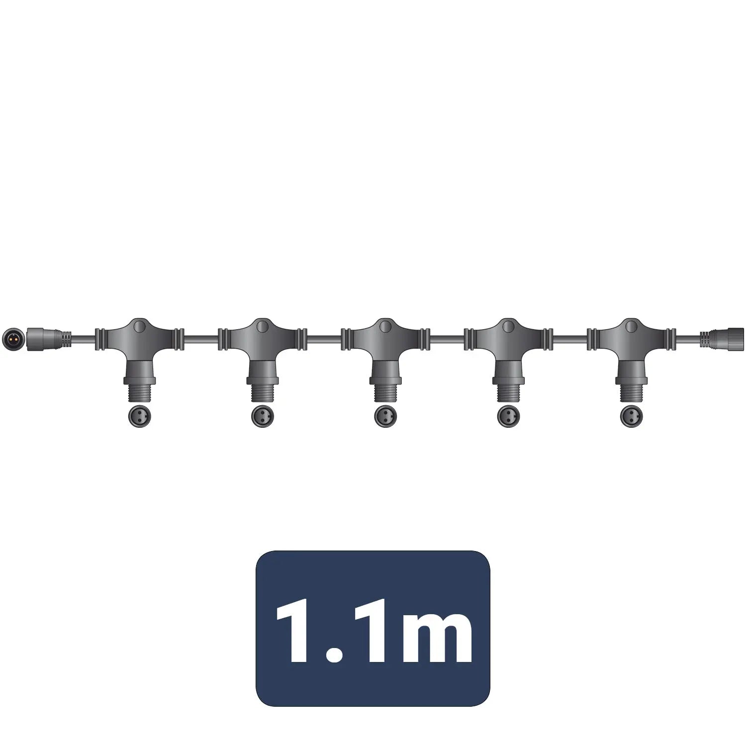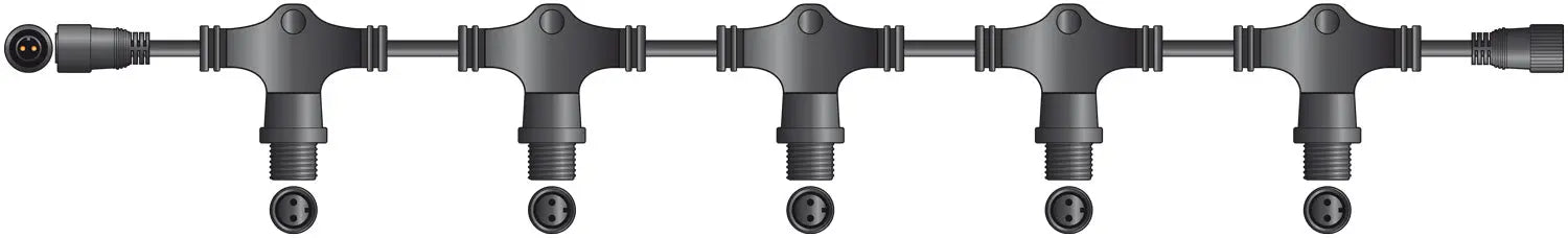Weatherproof rubber 5 way belt allowing for power to be sent in to five separate directions. Suitable for our 2 wire connectable static string light range.