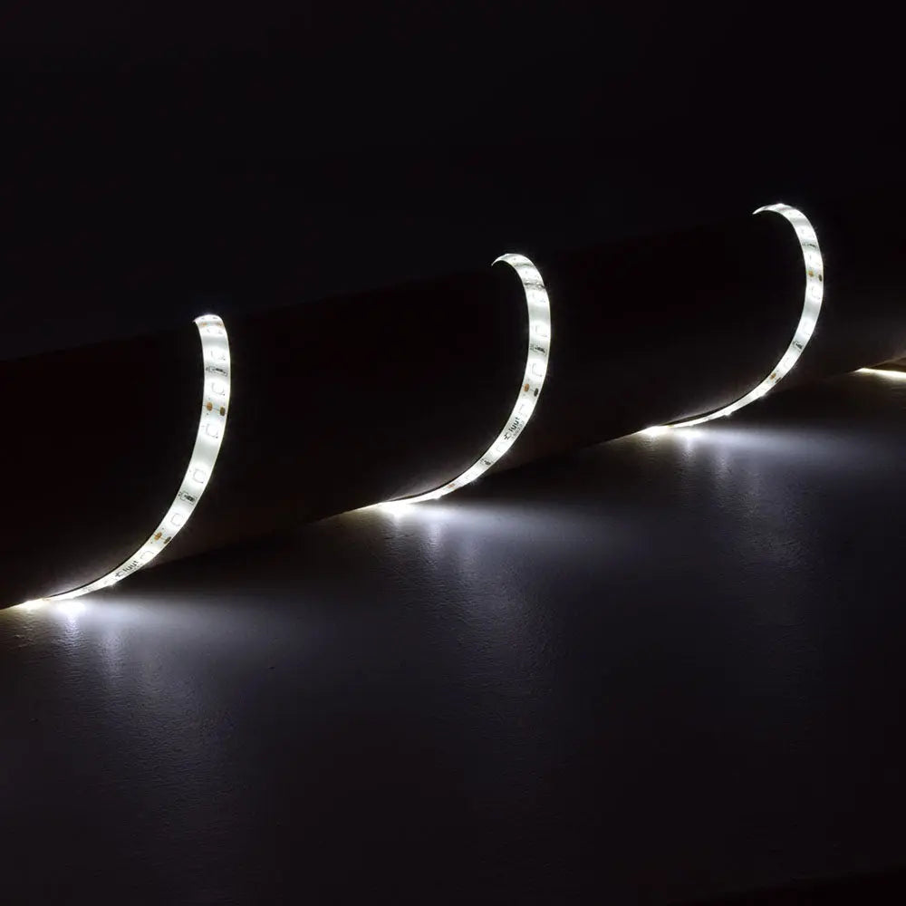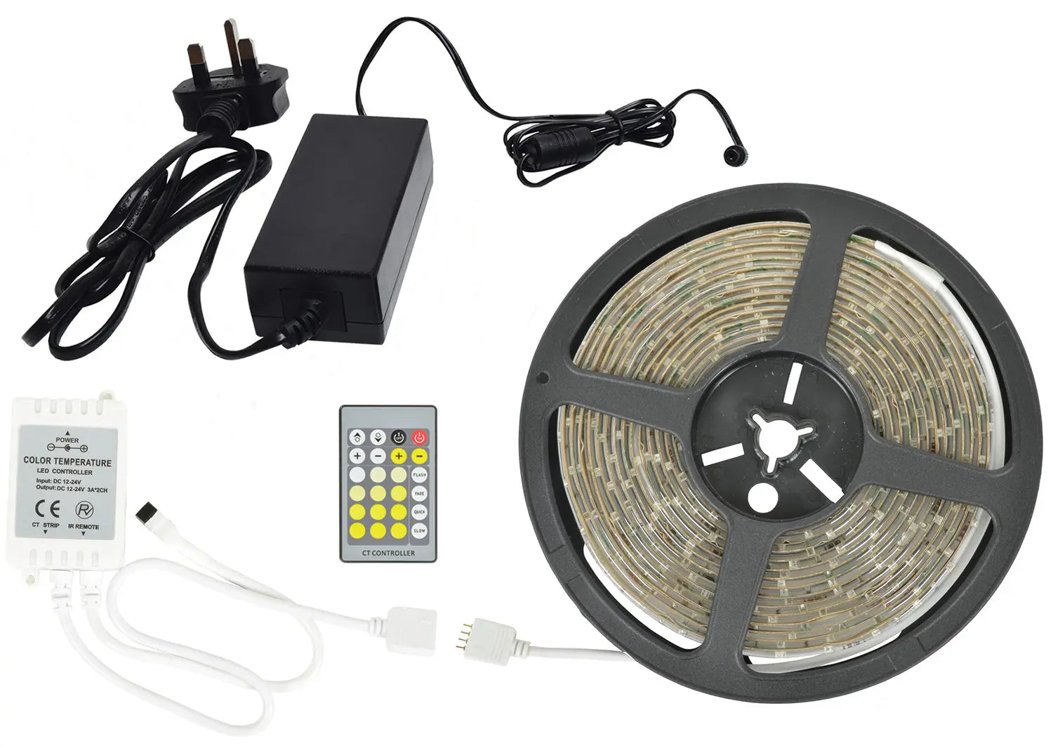 Retail ready colour box packed warm white / cool white LED tape together with UK adaptor power supply, IR controller and connectors to get started. The tape has an adhesive back and an epoxy coating to protect from damage and also makes it IP65 rated. Use the remote to set what sort of colour output you require such as cool white, warm white, or a mixture of both for a more neutral tone. It is low voltage operated at 12Vdc and the self adhesive backing allows for quick and easy installation in kitchens, bathrooms in either the home, caravan, cars or lorries.