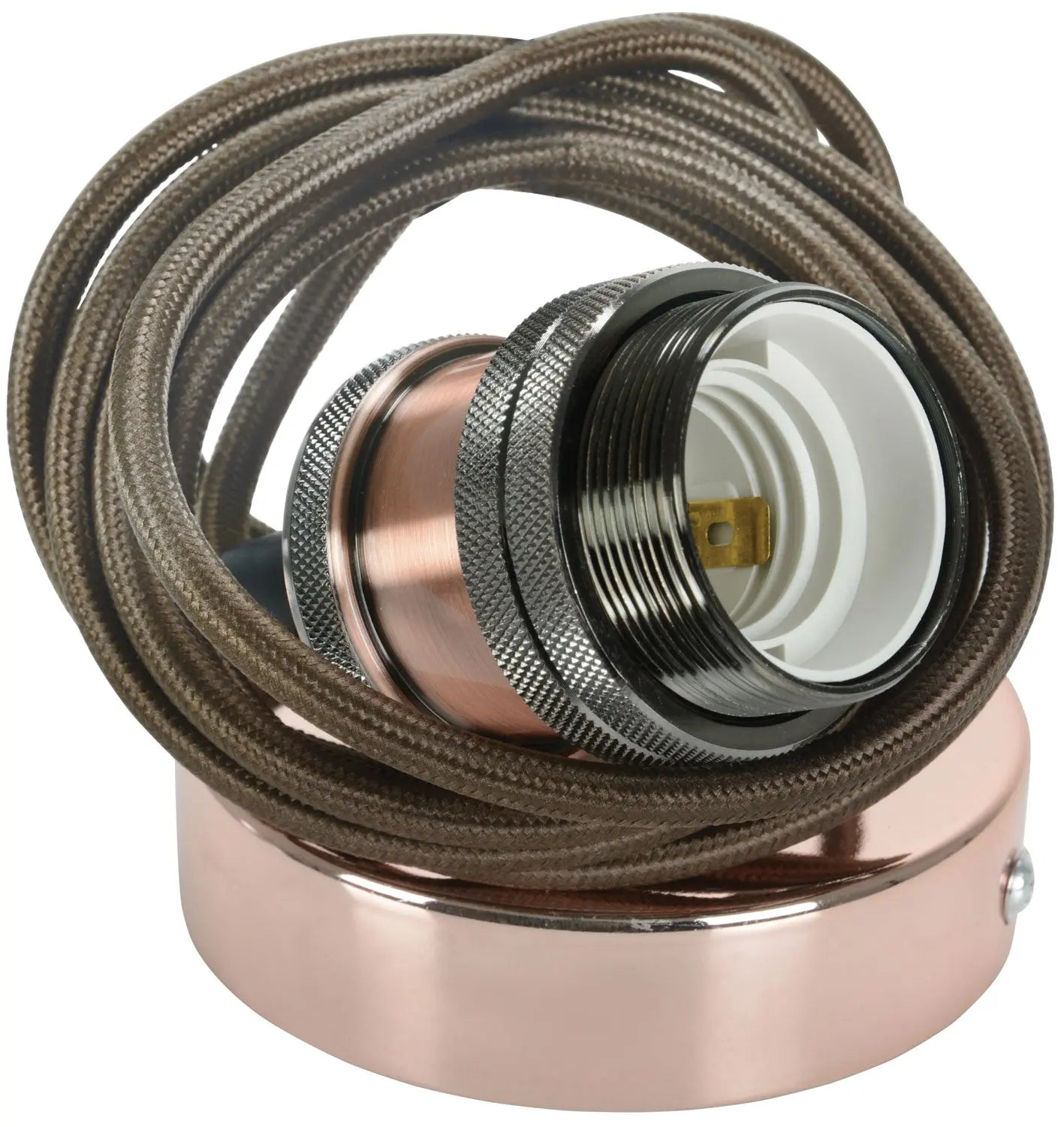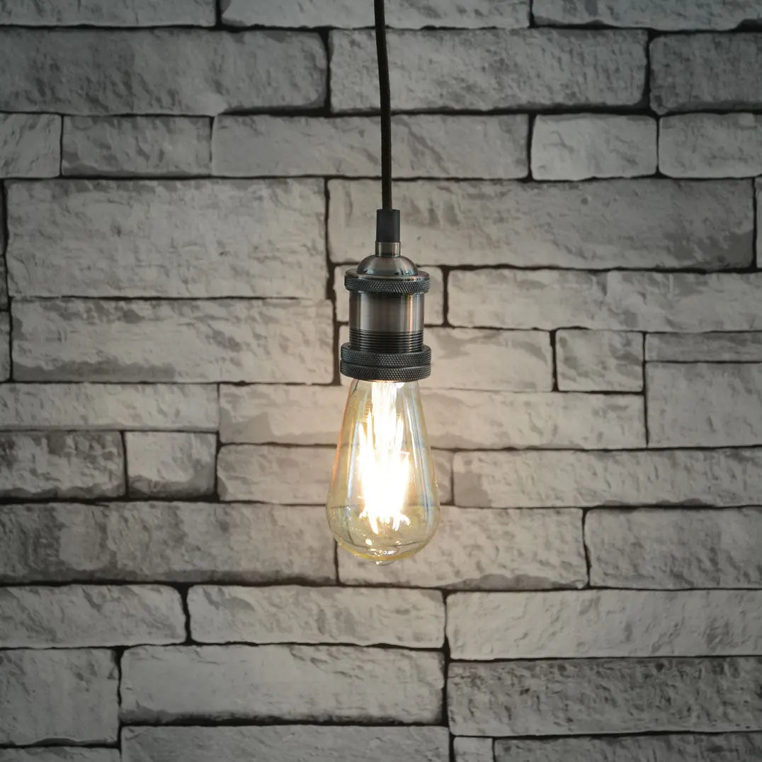 Decorative cord sets comprising an E27 lamp holder with plated aluminium cover, plated steel ceiling rose with internal terminal block and a 1.8m nylon braided mains cable, which can be cut to length and re-connected in the ceiling rose as required. Install with vintage style LED filament lamps to create a retro-style lighting scheme.