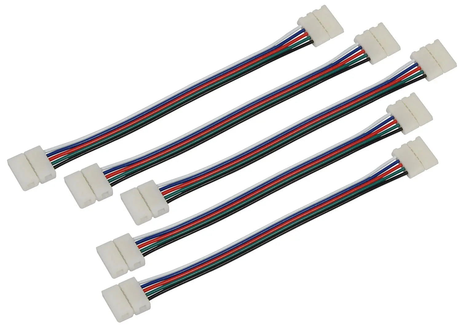 Pack of 5 flexible links comprising 135mm wire with a snap connector at each end for connecting lengths of RGBW LED tape to extend runs or negotiate corners. Snap connectors fit onto connection pads on the tape after paring back any silicone or waterproof coating to make an electrical connection without the need for solder. Where needed, these links can also be cut in half to provide bare wire connection to power supplies with screw terminals. A quick and mess-free solution for in-line connection in LED tape installations.